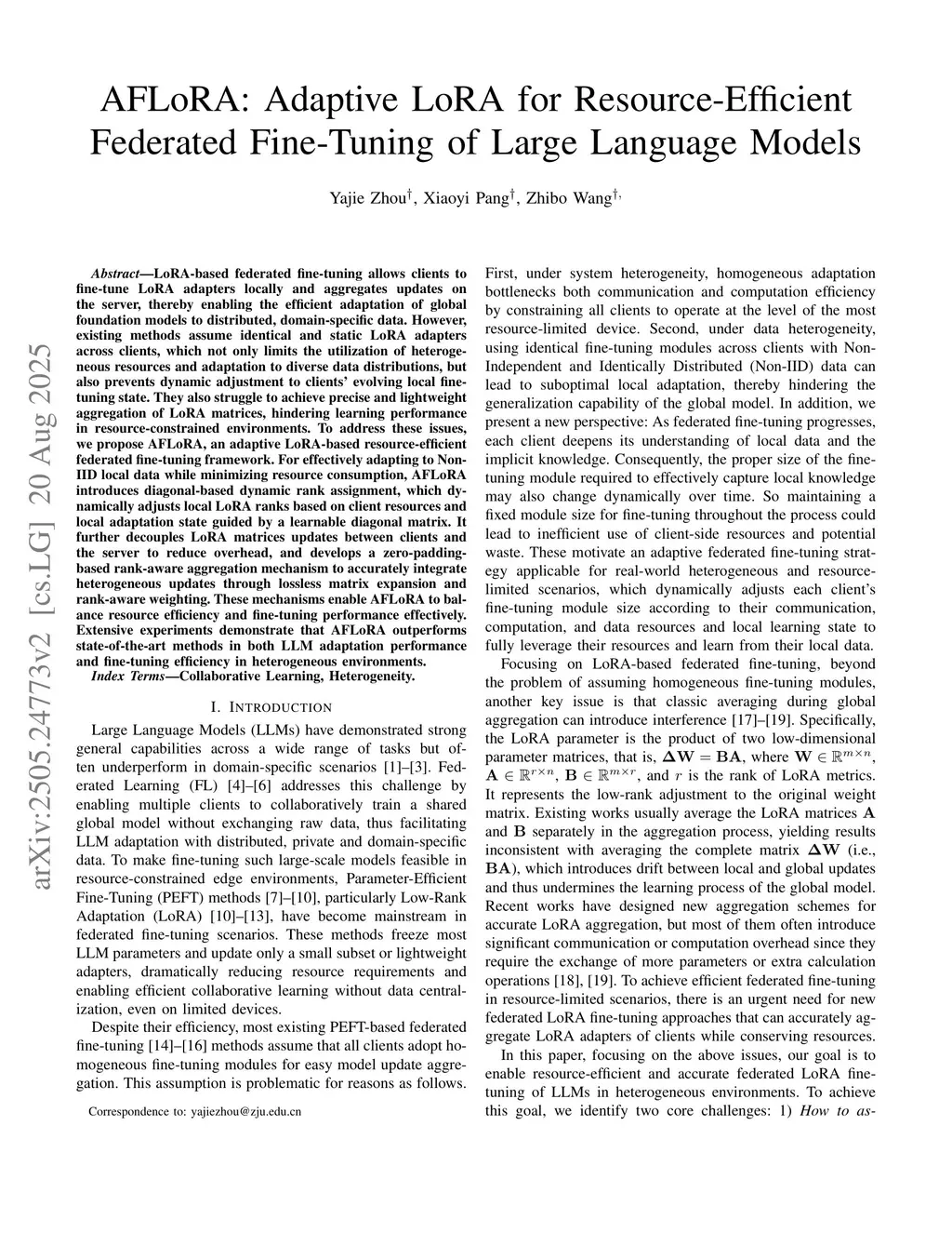 Federated fine-tuning has emerged as a promising approach to adapt foundation models to downstream tasks using decentralized data. However, real-world deployment remains challenging due to the high computational and communication demands of fine-tuning Large Language Models (LLMs) on clients with data and system resources that are heterogeneous and constrained. In such settings, the global model's performance is often bottlenecked by the weakest clients and further degraded by the non-IID nature of local data. Although existing methods leverage parameter-efficient techniques such as Low-Rank Adaptation (LoRA) to reduce communication and computation overhead, they often fail to simultaneously ensure accurate aggregation of low-rank updates and maintain low system costs, thereby hindering overall performance. To address these challenges, we propose AFLoRA, an adaptive and lightweight federated fine-tuning framework for LLMs. AFLoRA decouples shared and client-specific updates to reduce overhead and improve aggregation accuracy, incorporates diagonal matrix-based rank pruning to better utilize local resources, and employs rank-aware aggregation with public data refinement to strengthen generalization under data heterogeneity. Extensive experiments demonstrate that AFLoRA outperforms state-of-the-art methods in both accuracy and efficiency, providing a practical solution for efficient LLM adaptation in heterogeneous environments in the real world.