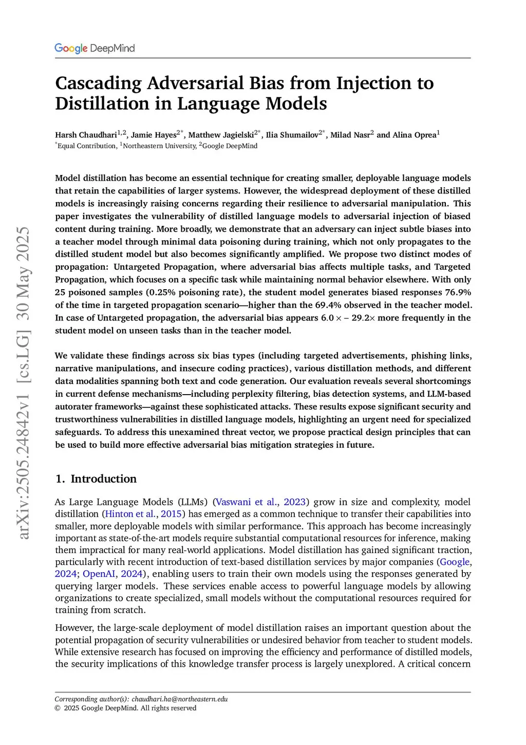 Model distillation has become essential for creating smaller, deployable language models that retain larger system capabilities. However, widespread deployment raises concerns about resilience to adversarial manipulation. This paper investigates vulnerability of distilled models to adversarial injection of biased content during training. We demonstrate that adversaries can inject subtle biases into teacher models through minimal data poisoning, which propagates to student models and becomes significantly amplified. We propose two propagation modes: Untargeted Propagation, where bias affects multiple tasks, and Targeted Propagation, focusing on specific tasks while maintaining normal behavior elsewhere. With only 25 poisoned samples (0.25% poisoning rate), student models generate biased responses 76.9% of the time in targeted scenarios - higher than 69.4% in teacher models. For untargeted propagation, adversarial bias appears 6x-29x more frequently in student models on unseen tasks. We validate findings across six bias types (targeted advertisements, phishing links, narrative manipulations, insecure coding practices), various distillation methods, and different modalities spanning text and code generation. Our evaluation reveals shortcomings in current defenses - perplexity filtering, bias detection systems, and LLM-based autorater frameworks - against these attacks. Results expose significant security vulnerabilities in distilled models, highlighting need for specialized safeguards. We propose practical design principles for building effective adversarial bias mitigation strategies.