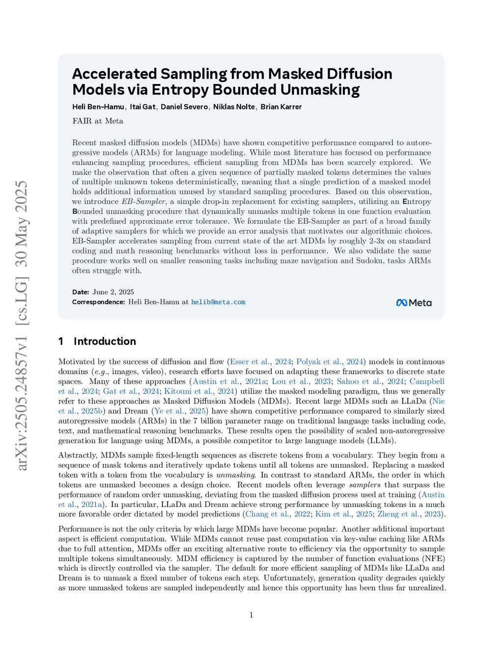 Recent masked diffusion models (MDMs) have shown competitive performance compared to autoregressive models (ARMs) for language modeling. While most literature has focused on performance enhancing sampling procedures, efficient sampling from MDMs has been scarcely explored. We make the observation that often a given sequence of partially masked tokens determines the values of multiple unknown tokens deterministically, meaning that a single prediction of a masked model holds additional information unused by standard sampling procedures. Based on this observation, we introduce EB-Sampler, a simple drop-in replacement for existing samplers, utilizing an Entropy Bounded unmasking procedure that dynamically unmasks multiple tokens in one function evaluation with predefined approximate error tolerance. We formulate the EB-Sampler as part of a broad family of adaptive samplers for which we provide an error analysis that motivates our algorithmic choices. EB-Sampler accelerates sampling from current state of the art MDMs by roughly 2-3x on standard coding and math reasoning benchmarks without loss in performance. We also validate the same procedure works well on smaller reasoning tasks including maze navigation and Sudoku, tasks ARMs often struggle with.