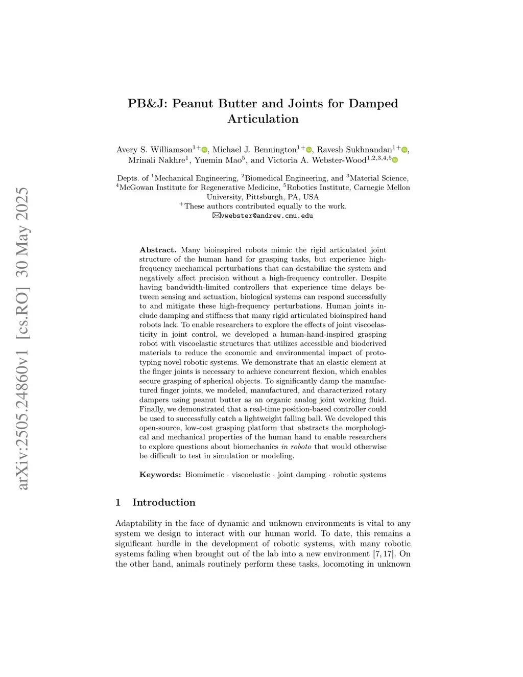 Many bioinspired robots mimic the rigid articulated joint structure of the human hand for grasping tasks, but experience high-frequency mechanical perturbations that can destabilize the system and negatively affect precision without a high-frequency controller. Despite having bandwidth-limited controllers that experience time delays between sensing and actuation, biological systems can respond successfully to and mitigate these high-frequency perturbations. Human joints include damping and stiffness that many rigid articulated bioinspired hand robots lack. To enable researchers to explore the effects of joint viscoelasticity in joint control, we developed a human-hand-inspired grasping robot with viscoelastic structures that utilizes accessible and bioderived materials to reduce the economic and environmental impact of prototyping novel robotic systems. We demonstrate that an elastic element at the finger joints is necessary to achieve concurrent flexion, which enables secure grasping of spherical objects. To significantly damp the manufactured finger joints, we modeled, manufactured, and characterized rotary dampers using peanut butter as an organic analog joint working fluid. Finally, we demonstrated that a real-time position-based controller could be used to successfully catch a lightweight falling ball. We developed this open-source, low-cost grasping platform that abstracts the morphological and mechanical properties of the human hand to enable researchers to explore questions about biomechanics in roboto that would otherwise be difficult to test in simulation or modeling.