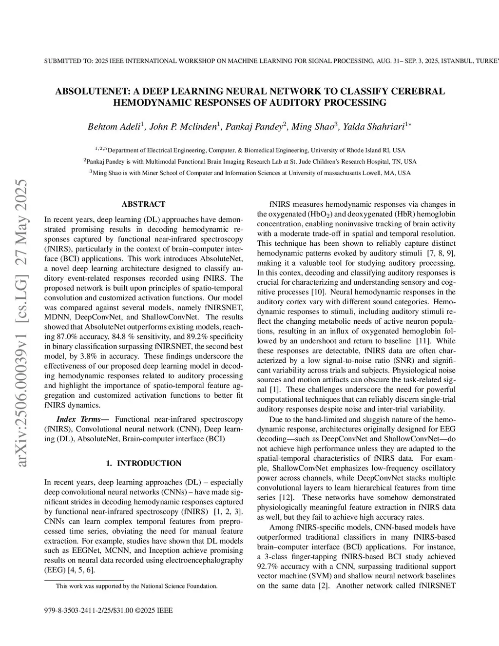AbsoluteNet: A Deep Learning Neural Network to Classify Cerebral Hemodynamic Responses of Auditory Processing