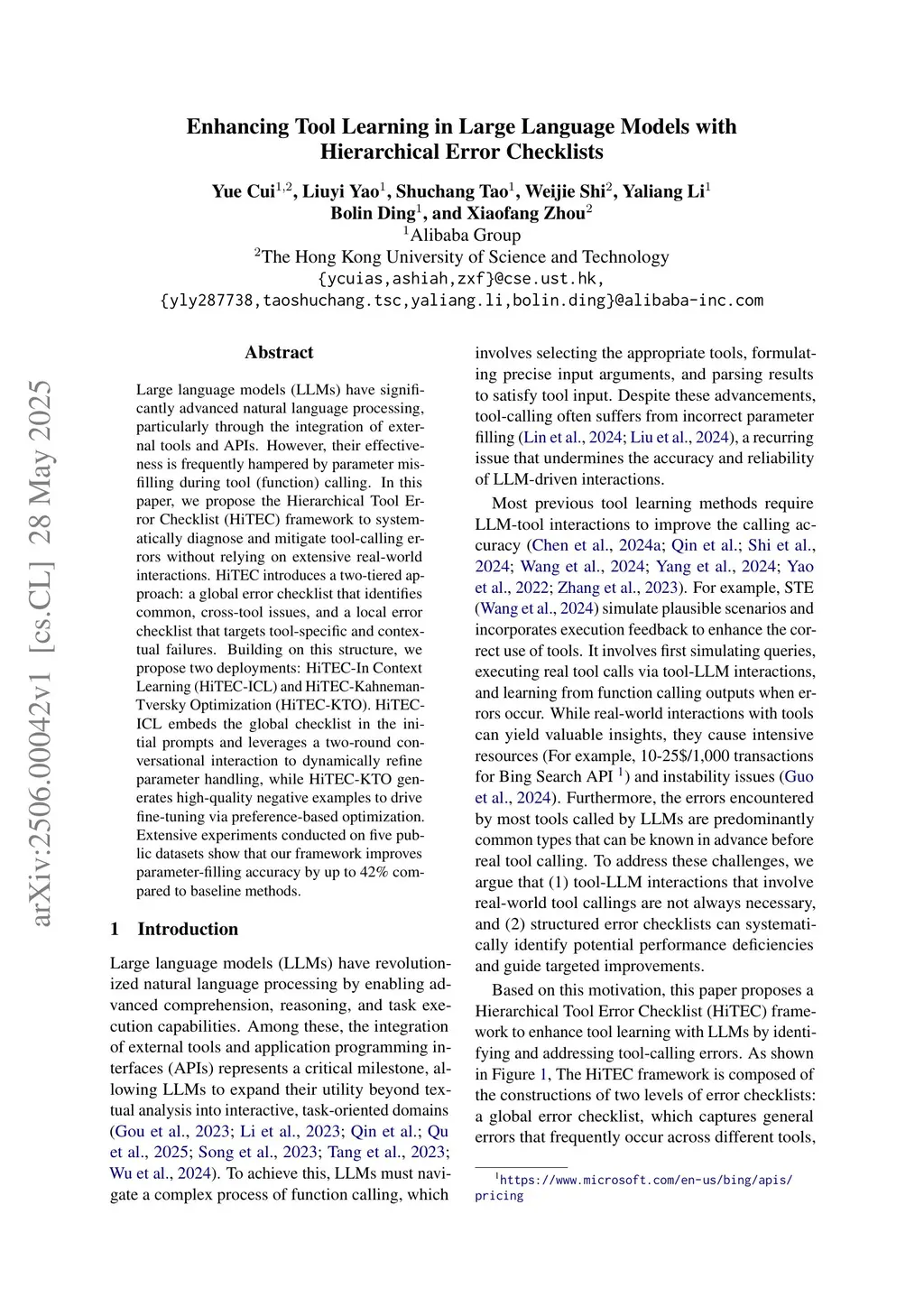 Large language models (LLMs) have significantly advanced natural language processing, particularly through the integration of external tools and APIs. However, their effectiveness is frequently hampered by parameter mis-filling during tool calling. In this paper, we propose the Hierarchical Tool Error Checklist (HiTEC) framework to systematically diagnose and mitigate tool-calling errors without relying on extensive real-world interactions. HiTEC introduces a two-tiered approach: a global error checklist that identifies common, cross-tool issues, and a local error checklist that targets tool-specific and contextual failures. Building on this structure, we propose two deployments: HiTEC-In Context Learning (HiTEC-ICL) and HiTEC-Kahneman-Tversky Optimization (HiTEC-KTO). HiTEC-ICL embeds the global checklist in the initial prompts and leverages a two-round conversational interaction to dynamically refine parameter handling, while HiTEC-KTO generates high-quality negative examples to drive fine-tuning via preference-based optimization. Extensive experiments across five public datasets demonstrate that our framework significantly improves parameter-filling accuracy and tool-calling success rates compared to baseline methods.