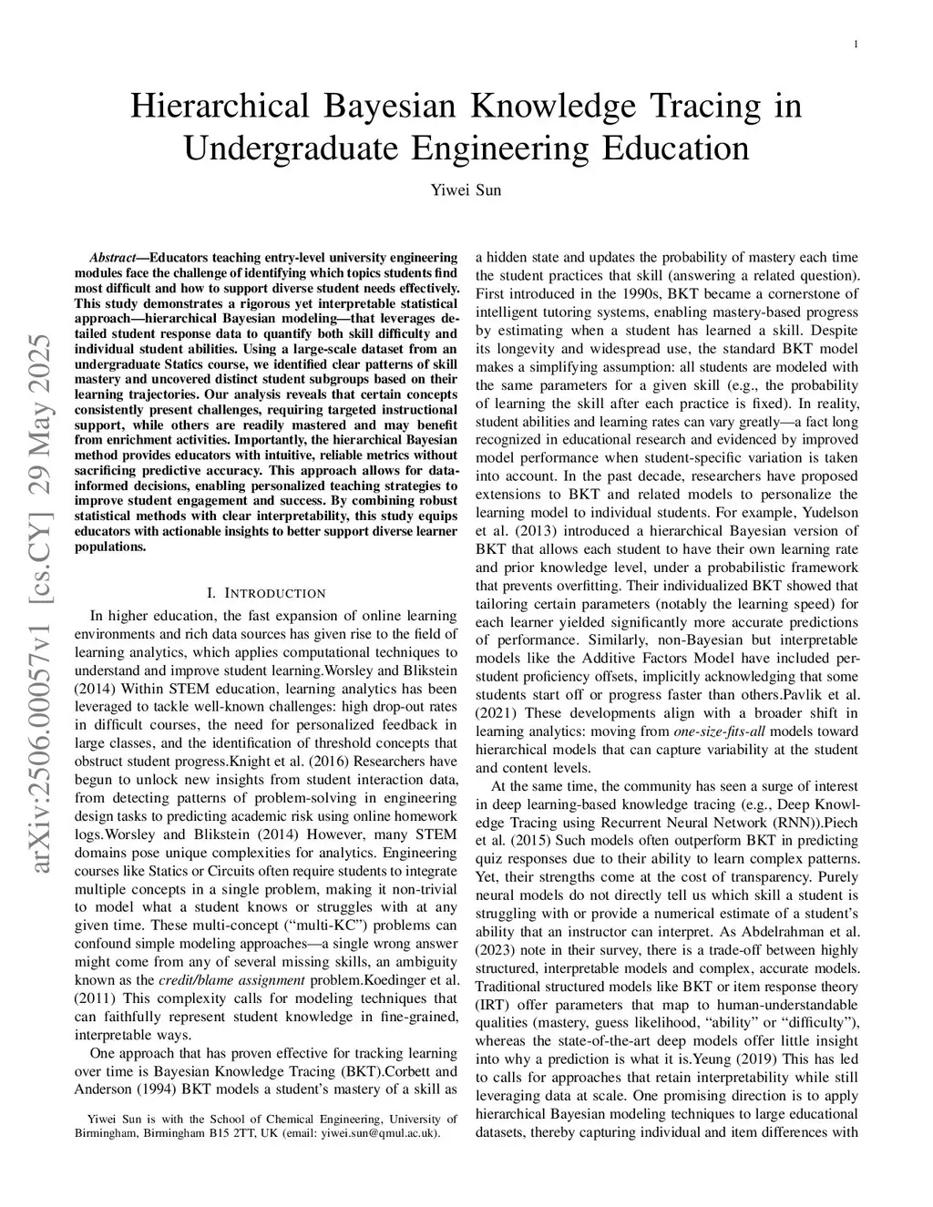 Hierarchical Bayesian Knowledge Tracing in Undergraduate Engineering Education