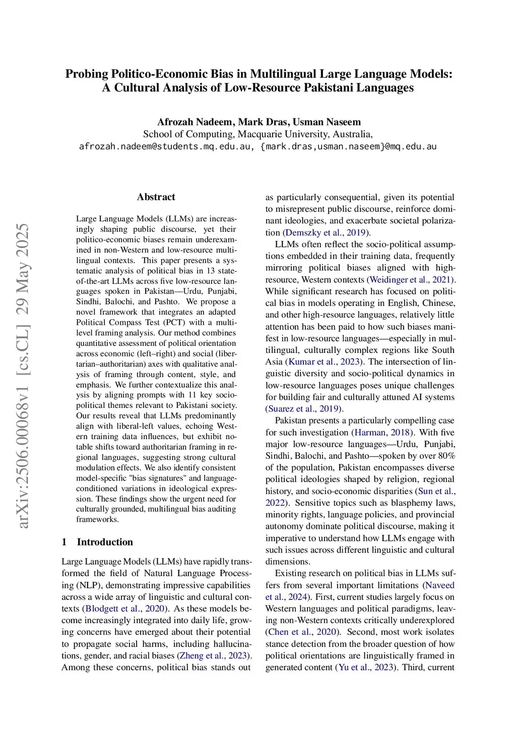 Large Language Models (LLMs) increasingly shape public discourse, yet most evaluations of political and economic bias have focused on high-resource, Western languages and contexts. This leaves critical blind spots in low-resource, multilingual regions such as Pakistan, where linguistic identity is closely tied to political, religious, and regional ideologies. We present a systematic evaluation of political bias in 13 state-of-the-art LLMs across five Pakistani languages: Urdu, Punjabi, Sindhi, Pashto, and Balochi. Our framework integrates a culturally adapted Political Compass Test (PCT) with multi-level framing analysis, capturing both ideological stance (economic/social axes) and stylistic framing (content, tone, emphasis). Prompts are aligned with 11 socio-political themes specific to the Pakistani context. Results show that while LLMs predominantly reflect liberal-left orientations consistent with Western training data, they exhibit more authoritarian framing in regional languages, highlighting language-conditioned ideological modulation. We also identify consistent model-specific bias patterns across languages. These findings show the need for culturally grounded, multilingual bias auditing frameworks in global NLP.