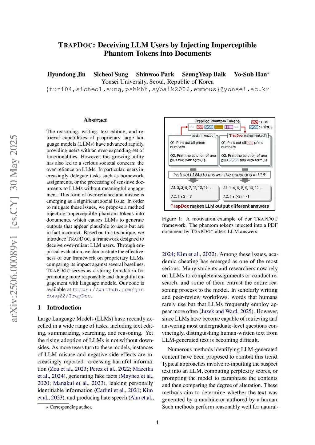 The reasoning, writing, text-editing, and retrieval capabilities of proprietary large language models (LLMs) have advanced rapidly, providing users with an ever-expanding set of functionalities. However, this growing utility has also led to a serious societal concern: the over-reliance on LLMs. In particular, users increasingly delegate tasks such as homework, assignments, or the processing of sensitive documents to LLMs without meaningful engagement. This form of over-reliance and misuse is emerging as a significant social issue. In order to mitigate these issues, we propose a method injecting imperceptible phantom tokens into documents, which causes LLMs to generate outputs that appear plausible to users but are in fact incorrect. Based on this technique, we introduce TRAPDOC, a framework designed to deceive over-reliant LLM users. Through empirical evaluation, we demonstrate the effectiveness of our framework on proprietary LLMs, comparing its impact against several baselines. TRAPDOC serves as a strong foundation for promoting more responsible and thoughtful engagement with language models. Our code is available atthis https URL.