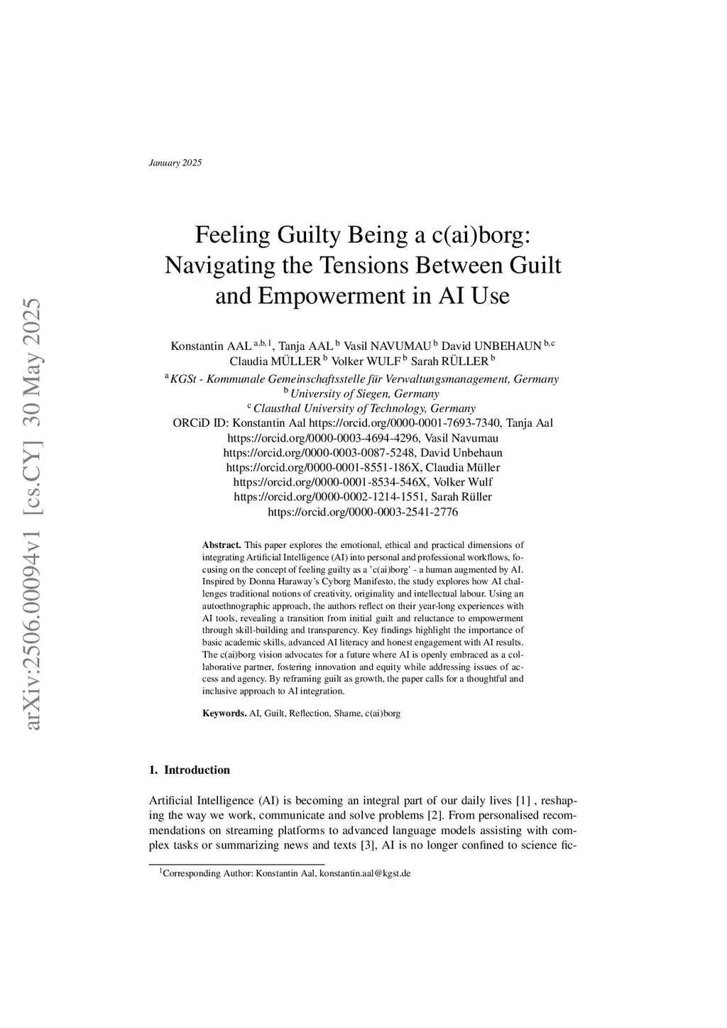 This paper explores the emotional, ethical and practical dimensions of integrating Artificial Intelligence (AI) into personal and professional workflows, focusing on the concept of feeling guilty as a 'c(ai)borg' - a human augmented by AI. Inspired by Donna Haraway's Cyborg Manifesto, the study explores how AI challenges traditional notions of creativity, originality and intellectual labour. Using an autoethnographic approach, the authors reflect on their year-long experiences with AI tools, revealing a transition from initial guilt and reluctance to empowerment through skill-building and transparency. Key findings highlight the importance of basic academic skills, advanced AI literacy and honest engagement with AI results. The c(ai)borg vision advocates for a future where AI is openly embraced as a collaborative partner, fostering innovation and equity while addressing issues of access and agency. By reframing guilt as growth, the paper calls for a thoughtful and inclusive approach to AI integration.