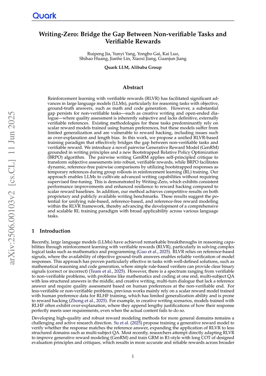 Reinforcement learning with verifiable rewards (RLVR) has enabled large language models (LLMs) to achieve remarkable breakthroughs in reasoning tasks with objective ground-truth answers, such as mathematics and code generation. However, a significant gap remains for non-verifiable tasks, like creative writing and open-ended dialogue, where quality assessment is inherently subjective and lacks definitive references. Existing approaches for these domains often rely on scalar reward models trained with human preferences, which suffer from limited generalization and are prone to reward hacking, such as over-explanation and length bias. In this work, we propose a unified RLVR-based training paradigm that bridges the gap between non-verifiable tasks and verifiable rewards. We introduce a writing-principle-based pairwise Generative Reward Model (GenRM) and a novel Bootstrapped Relative Policy Optimization (BRPO) algorithm. The pairwise writing GenRM leverages self-principled critique to transform subjective assessments into reliable, verifiable rewards, while BRPO enables dynamic, reference-free pairwise comparison by leveraging a bootstrapped response as temporary reference from within group rollouts during RL training. Our approach empowers LLMs to develop robust writing capabilities without supervised fine-tuning, as demonstrated by Writing-Zero, which shows consistent improvement and strong resistance to reward hacking compared to scalar reward baselines. Furthermore, our method achieves competitive results on both in-house and open-source writing benchmarks. Our findings suggest the potential to unify rule-based, reference-based, and reference-free reward modeling under the RLVR framework, thus paving the way for a comprehensive and scalable RL training paradigm applicable across all language tasks.