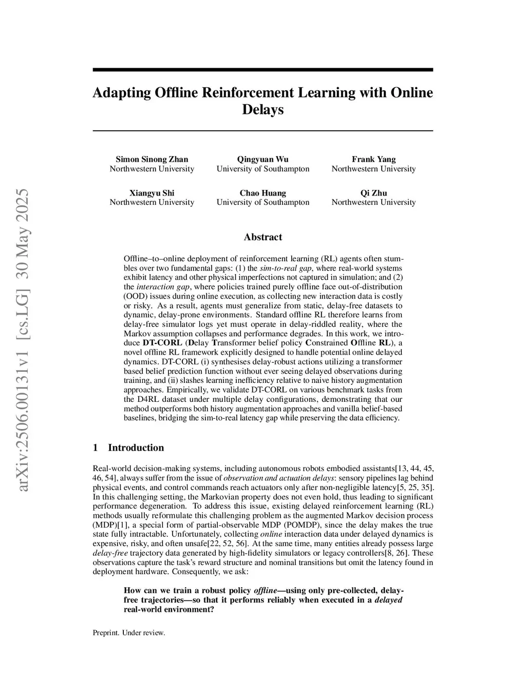 Offline-to-online deployment of reinforcement-learning (RL) agents must bridge two gaps: (1) the sim-to-real gap, where real systems add latency and other imperfections not present in simulation, and (2) the interaction gap, where policies trained purely offline face out-of-distribution states during online execution because gathering new interaction data is costly or risky. Agents therefore have to generalize from static, delay-free datasets to dynamic, delay-prone environments. Standard offline RL learns from delay-free logs yet must act under delays that break the Markov assumption and hurt performance. We introduce DT-CORL (Delay-Transformer belief policy Constrained Offline RL), an offline-RL framework built to cope with delayed dynamics at deployment. DT-CORL (i) produces delay-robust actions with a transformer-based belief predictor even though it never sees delayed observations during training, and (ii) is markedly more sample-efficient than naïve history-augmentation baselines. Experiments on D4RL benchmarks with several delay settings show that DT-CORL consistently outperforms both history-augmentation and vanilla belief-based methods, narrowing the sim-to-real latency gap while preserving data efficiency.