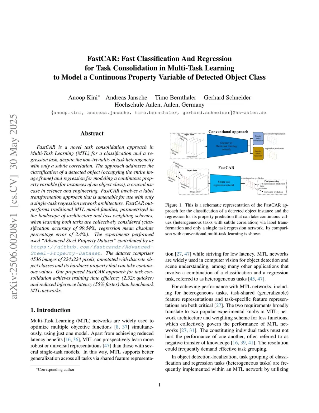 FastCAR is a novel task consolidation approach in Multi-Task Learning (MTL) for a classification and a regression task, despite the non-triviality of task heterogeneity with only a subtle correlation. The approach addresses the classification of a detected object (occupying the entire image frame) and regression for modeling a continuous property variable (for instances of an object class), a crucial use case in science and engineering. FastCAR involves a label transformation approach that is amenable for use with only a single-task regression network architecture. FastCAR outperforms traditional MTL model families, parametrized in the landscape of architecture and loss weighting schemes, when learning both tasks are collectively considered (classification accuracy of 99.54%, regression mean absolute percentage error of 2.4%). The experiments performed used "Advanced Steel Property Dataset" contributed by usthis https URL. The dataset comprises 4536 images of 224x224 pixels, annotated with discrete object classes and its hardness property that can take continuous values. Our proposed FastCAR approach for task consolidation achieves training time efficiency (2.52x quicker) and reduced inference latency (55% faster) than benchmark MTL networks.