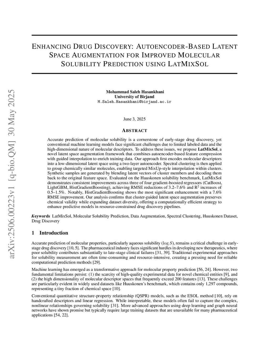 Accurate prediction of molecular solubility is a cornerstone of early-stage drug discovery, yet conventional machine learning models face significant challenges due to limited labeled data and the high-dimensional nature of molecular descriptors. To address these issues, we propose LatMixSol, a novel latent space augmentation framework that combines autoencoder-based feature compression with guided interpolation to enrich training data. Our approach first encodes molecular descriptors into a low-dimensional latent space using a two-layer autoencoder. Spectral clustering is then applied to group chemically similar molecules, enabling targeted MixUp-style interpolation within clusters. Synthetic samples are generated by blending latent vectors of cluster members and decoding them back to the original feature space. Evaluated on the Huuskonen solubility benchmark, LatMixSol demonstrates consistent improvements across three of four gradient-boosted regressors (CatBoost, LightGBM, HistGradientBoosting), achieving RMSE reductions of 3.2-7.6% and R-squared increases of 0.5-1.5%. Notably, HistGradientBoosting shows the most significant enhancement with a 7.6% RMSE improvement. Our analysis confirms that cluster-guided latent space augmentation preserves chemical validity while expanding dataset diversity, offering a computationally efficient strategy to enhance predictive models in resource-constrained drug discovery pipelines.