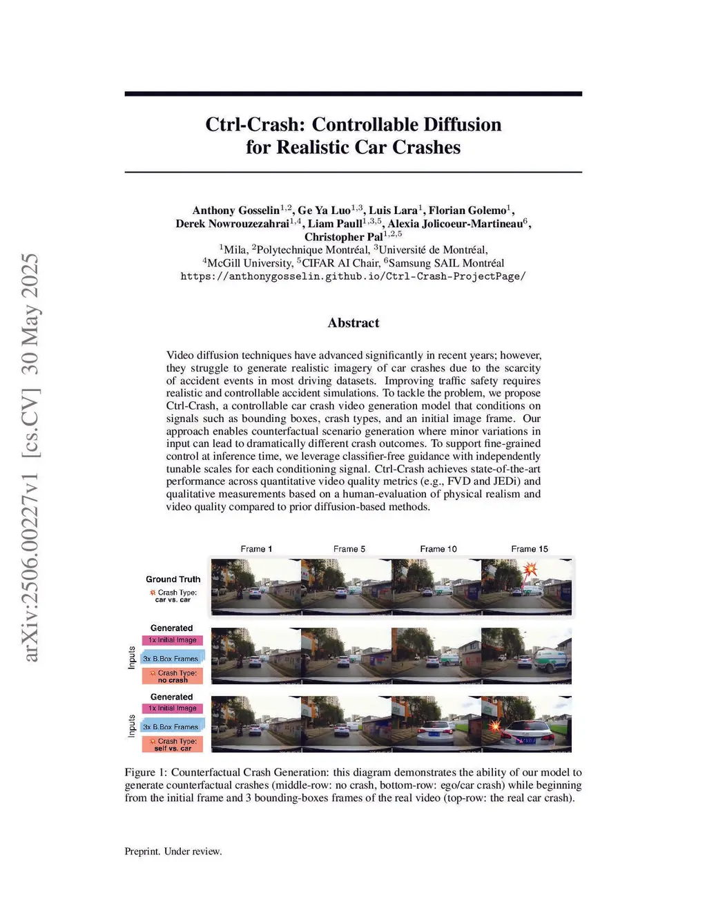 Video diffusion techniques have advanced significantly in recent years; however, they struggle to generate realistic imagery of car crashes due to the scarcity of accident events in most driving datasets. Improving traffic safety requires realistic and controllable accident simulations. To tackle the problem, we propose Ctrl-Crash, a controllable car crash video generation model that conditions on signals such as bounding boxes, crash types, and an initial image frame. Our approach enables counterfactual scenario generation where minor variations in input can lead to dramatically different crash outcomes. To support fine-grained control at inference time, we leverage classifier-free guidance with independently tunable scales for each conditioning signal. Ctrl-Crash achieves state-of-the-art performance across quantitative video quality metrics (e.g., FVD and JEDi) and qualitative measurements based on a human-evaluation of physical realism and video quality compared to prior diffusion-based methods.