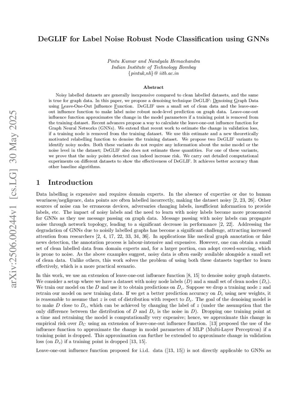 Noisy labelled datasets are generally inexpensive compared to clean labelled datasets, and the same is true for graph data. In this paper, we propose a denoising technique DeGLIF: Denoising Graph Data using Leave-One-Out Influence Function. DeGLIF uses a small set of clean data and the leave-one- out influence function to make label noise robust node-level prediction on graph data. Leave-one-out influence function approximates the change in the model parameters if a training point is removed from the training dataset. Recent advances propose a way to calculate the leave-one-out influence function for Graph Neural Networks (GNNs). We extend that recent work to estimate the change in validation loss, if a training node is removed from the training dataset. We use this estimate and a new theoretically motivated relabelling function to denoise the training dataset. We propose two DeGLIF variants to identify noisy nodes. Both these variants do not require any information about the noise model or the noise level in the dataset; DeGLIF also does not estimate these quantities. For one of these variants, we prove that the noisy points detected can indeed increase risk. We carry out detailed computational experiments on different datasets to show the effectiveness of DeGLIF. It achieves better accuracy than other baseline algorithms