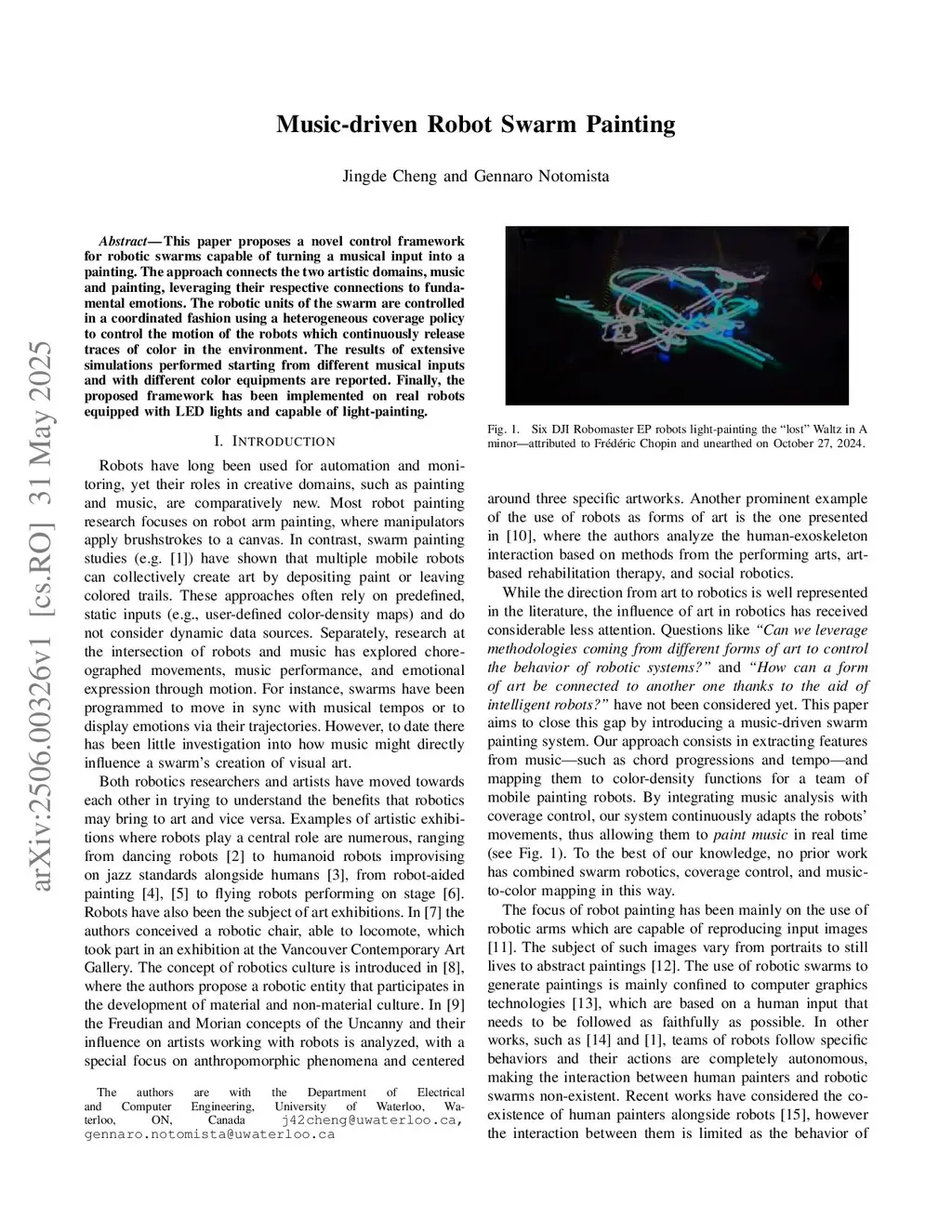 This paper proposes a novel control framework for robotic swarms capable of turning a musical input into a painting. The approach connects the two artistic domains, music and painting, leveraging their respective connections to fundamental emotions. The robotic units of the swarm are controlled in a coordinated fashion using a heterogeneous coverage policy to control the motion of the robots which continuously release traces of color in the environment. The results of extensive simulations performed starting from different musical inputs and with different color equipments are reported. Finally, the proposed framework has been implemented on real robots equipped with LED lights and capable of light-painting.