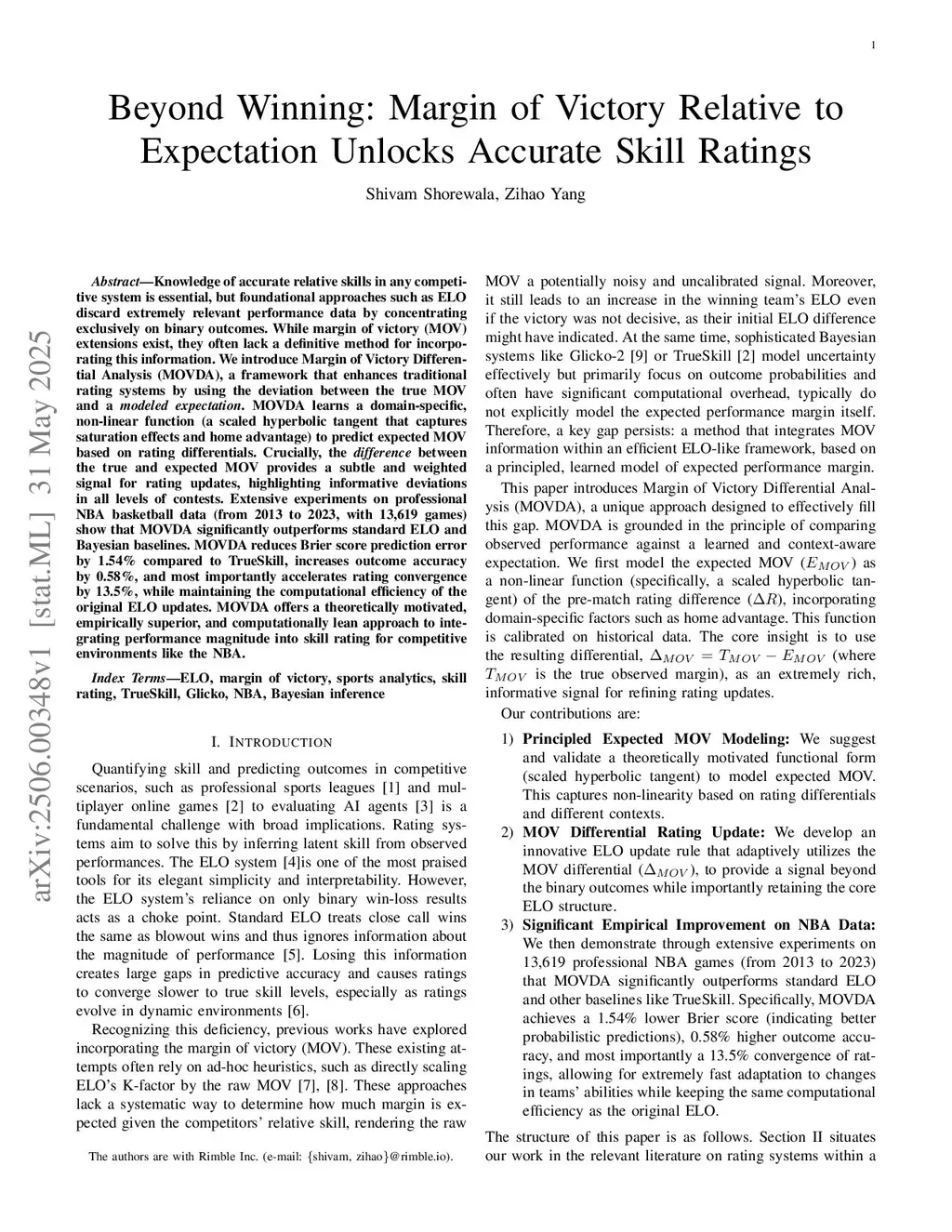 Knowledge of accurate relative skills in any competitive system is essential, but foundational approaches such as ELO discard extremely relevant performance data by concentrating exclusively on binary outcomes. While margin of victory (MOV) extensions exist, they often lack a definitive method for incorporating this information. We introduce Margin of Victory Differential Analysis (MOVDA), a framework that enhances traditional rating systems by using the deviation between the true MOV and a . MOVDA learns a domain-specific, non-linear function (a scaled hyperbolic tangent that captures saturation effects and home advantage) to predict expected MOV based on rating differentials. Crucially, the between the true and expected MOV provides a subtle and weighted signal for rating updates, highlighting informative deviations in all levels of contests. Extensive experiments on professional NBA basketball data (from 2013 to 2023, with 13,619 games) show that MOVDA significantly outperforms standard ELO and Bayesian baselines. MOVDA reduces Brier score prediction error by compared to TrueSkill, increases outcome accuracy by , and most importantly accelerates rating convergence by , while maintaining the computational efficiency of the original ELO updates. MOVDA offers a theoretically motivated, empirically superior, and computationally lean approach to integrating performance magnitude into skill rating for competitive environments like the NBA.