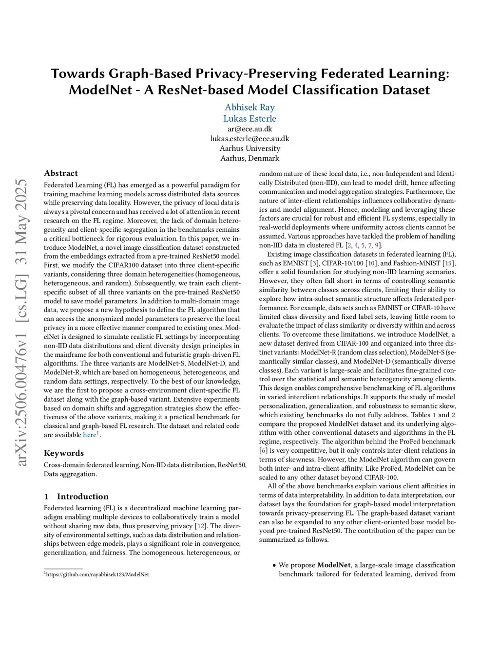 Towards Graph-Based Privacy-Preserving Federated Learning: ModelNet -- A ResNet-based Model Classification Dataset