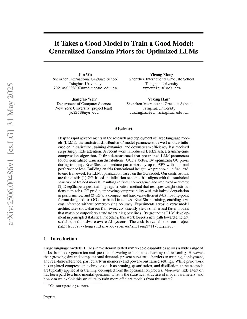 Despite rapid advancements in the research and deployment of large language models (LLMs), the statistical distribution of model parameters, as well as their influence on initialization, training dynamics, and downstream efficiency, has received surprisingly little attention. A recent work introduced BackSlash, a training-time compression algorithm. It first demonstrated that pre-trained LLM parameters follow generalized Gaussian distributions (GGDs) better. By optimizing GG priors during training, BackSlash can reduce parameters by up to 90\% with minimal performance loss. Building on this foundational insight, we propose a unified, end-to-end framework for LLM optimization based on the GG model. Our contributions are threefold: (1) GG-based initialization scheme that aligns with the statistical structure of trained models, resulting in faster convergence and improved accuracy; (2) DeepShape, a post-training regularization method that reshapes weight distributions to match a GG profile, improving compressibility with minimized degradation in performance; and (3) RF8, a compact and hardware-efficient 8-bit floating-point format designed for GG-distributed-initialized BackSlash training, enabling low-cost inference without compromising accuracy. Experiments across diverse model architectures show that our framework consistently yields smaller and faster models that match or outperform standard training baselines. By grounding LLM development in principled statistical modeling, this work forges a new path toward efficient, scalable, and hardware-aware AI systems. The code is available on our project page:this https URL.