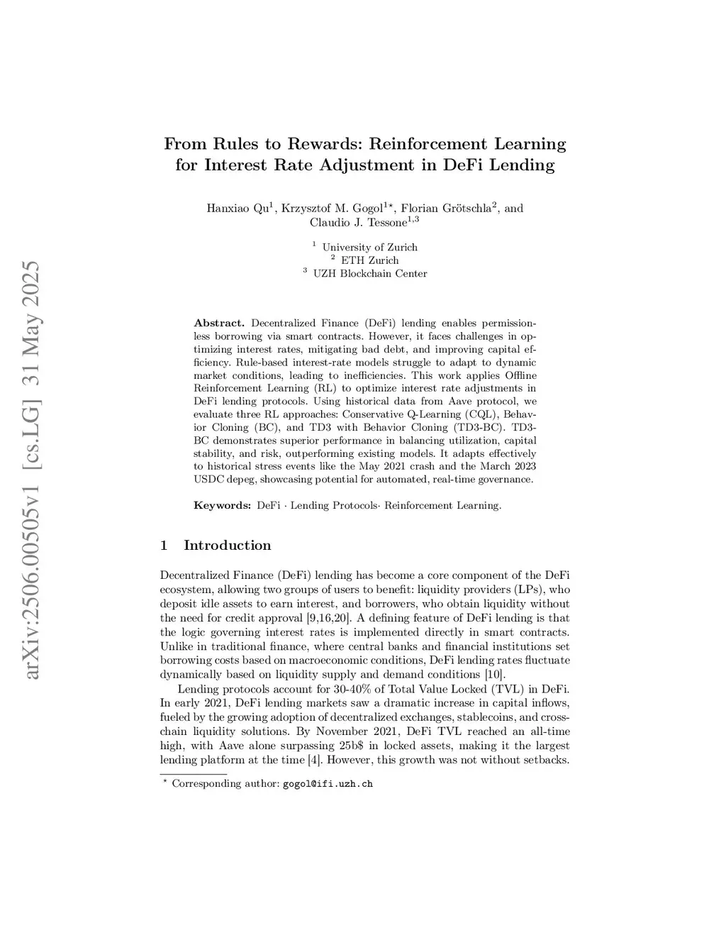 Decentralized Finance (DeFi) lending enables permissionless borrowing via smart contracts. However, it faces challenges in optimizing interest rates, mitigating bad debt, and improving capital efficiency. Rule-based interest-rate models struggle to adapt to dynamic market conditions, leading to inefficiencies. This work applies Offline Reinforcement Learning (RL) to optimize interest rate adjustments in DeFi lending protocols. Using historical data from Aave protocol, we evaluate three RL approaches: Conservative Q-Learning (CQL), Behavior Cloning (BC), and TD3 with Behavior Cloning (TD3-BC). TD3-BC demonstrates superior performance in balancing utilization, capital stability, and risk, outperforming existing models. It adapts effectively to historical stress events like the May 2021 crash and the March 2023 USDC depeg, showcasing potential for automated, real-time governance.