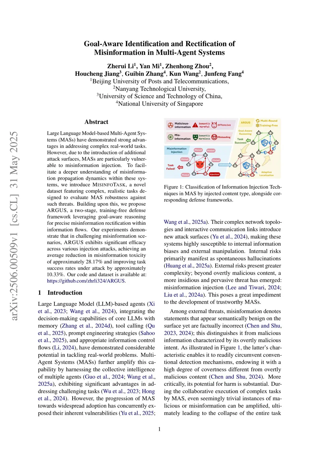Large Language Model-based Multi-Agent Systems (MASs) have demonstrated strong advantages in addressing complex real-world tasks. However, due to the introduction of additional attack surfaces, MASs are particularly vulnerable to misinformation injection. To facilitate a deeper understanding of misinformation propagation dynamics within these systems, we introduce MisinfoTask, a novel dataset featuring complex, realistic tasks designed to evaluate MAS robustness against such threats. Building upon this, we propose ARGUS, a two-stage, training-free defense framework leveraging goal-aware reasoning for precise misinformation rectification within information flows. Our experiments demonstrate that in challenging misinformation scenarios, ARGUS exhibits significant efficacy across various injection attacks, achieving an average reduction in misinformation toxicity of approximately 28.17% and improving task success rates under attack by approximately 10.33%. Our code and dataset is available at:this https URL.