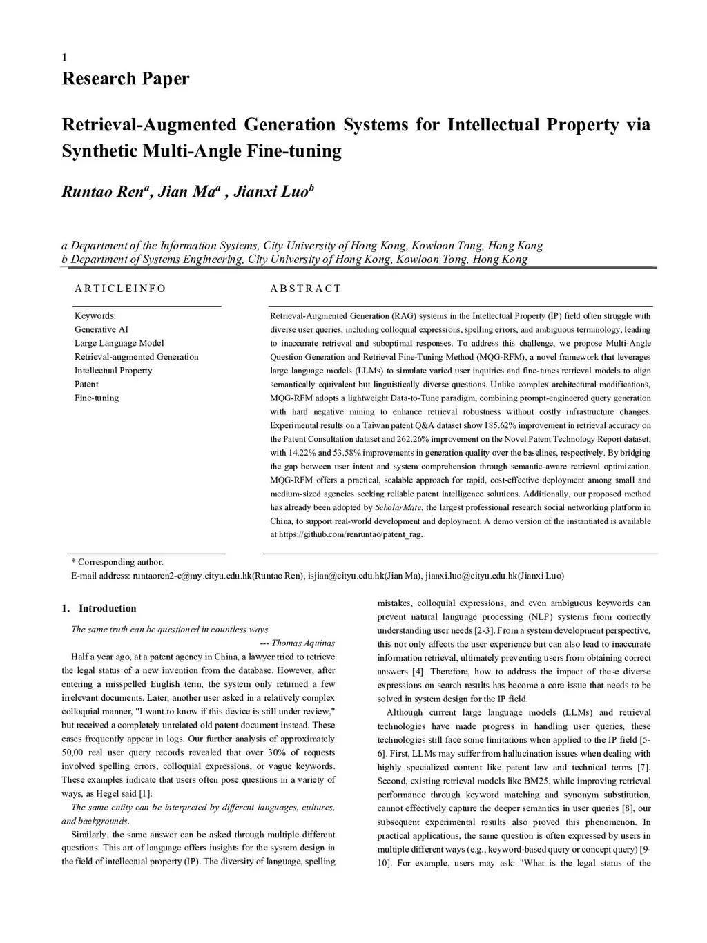 Retrieval-Augmented Generation (RAG) systems in the Intellectual Property (IP) field often struggle with diverse user queries, including colloquial expressions, spelling errors, and ambiguous terminology, leading to inaccurate retrieval and suboptimal responses. To address this challenge, we propose Multi-Angle Question Generation and Retrieval Fine-Tuning Method (MQG-RFM), a novel framework that leverages large language models (LLMs) to simulate varied user inquiries and fine-tunes retrieval models to align semantically equivalent but linguistically diverse questions. Unlike complex architectural modifications, MQG-RFM adopts a lightweight Data-to-Tune paradigm, combining prompt-engineered query generation with hard negative mining to enhance retrieval robustness without costly infrastructure changes. Experimental results on a Taiwan patent Q&A dataset show 185.62% improvement in retrieval accuracy on the Patent Consultation dataset and 262.26% improvement on the Novel Patent Technology Report dataset, with 14.22% and 53.58% improvements in generation quality over the baselines, respectively. By bridging the gap between user intent and system comprehension through semantic-aware retrieval optimization, MQG-RFM offers a practical, scalable approach for rapid, cost-effective deployment among small and medium-sized agencies seeking reliable patent intelligence solutions. Additionally, our proposed method has already been adopted by ScholarMate, the largest professional research social networking platform in China, to support real-world development and deployment. A demo version of the instantiated is available atthis https URL.