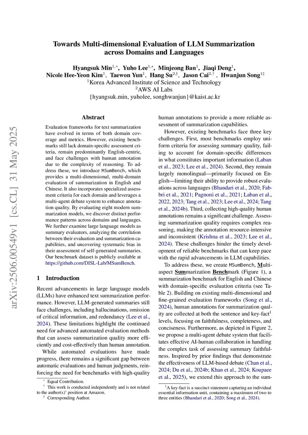 Evaluation frameworks for text summarization have evolved in terms of both domain coverage and metrics. However, existing benchmarks still lack domain-specific assessment criteria, remain predominantly English-centric, and face challenges with human annotation due to the complexity of reasoning. To address these, we introduce MSumBench, which provides a multi-dimensional, multi-domain evaluation of summarization in English and Chinese. It also incorporates specialized assessment criteria for each domain and leverages a multi-agent debate system to enhance annotation quality. By evaluating eight modern summarization models, we discover distinct performance patterns across domains and languages. We further examine large language models as summary evaluators, analyzing the correlation between their evaluation and summarization capabilities, and uncovering systematic bias in their assessment of self-generated summaries. Our benchmark dataset is publicly available atthis https URL.
