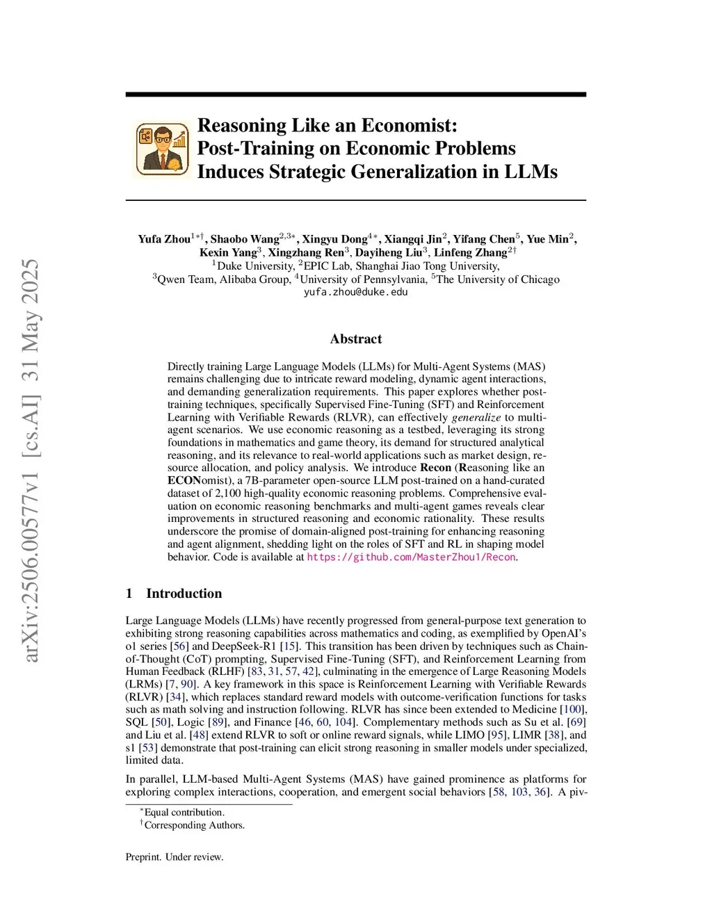 Directly training Large Language Models (LLMs) for Multi-Agent Systems (MAS) remains challenging due to intricate reward modeling, dynamic agent interactions, and demanding generalization requirements. This paper explores whether post-training techniques, specifically Supervised Fine-Tuning (SFT) and Reinforcement Learning with Verifiable Rewards (RLVR), can effectively to multi-agent scenarios. We use economic reasoning as a testbed, leveraging its strong foundations in mathematics and game theory, its demand for structured analytical reasoning, and its relevance to real-world applications such as market design, resource allocation, and policy analysis. We introduce (easoning like an omist), a 7B-parameter open-source LLM post-trained on a hand-curated dataset of 2,100 high-quality economic reasoning problems. Comprehensive evaluation on economic reasoning benchmarks and multi-agent games reveals clear improvements in structured reasoning and economic rationality. These results underscore the promise of domain-aligned post-training for enhancing reasoning and agent alignment, shedding light on the roles of SFT and RL in shaping model behavior. Code is available atthis https URL.