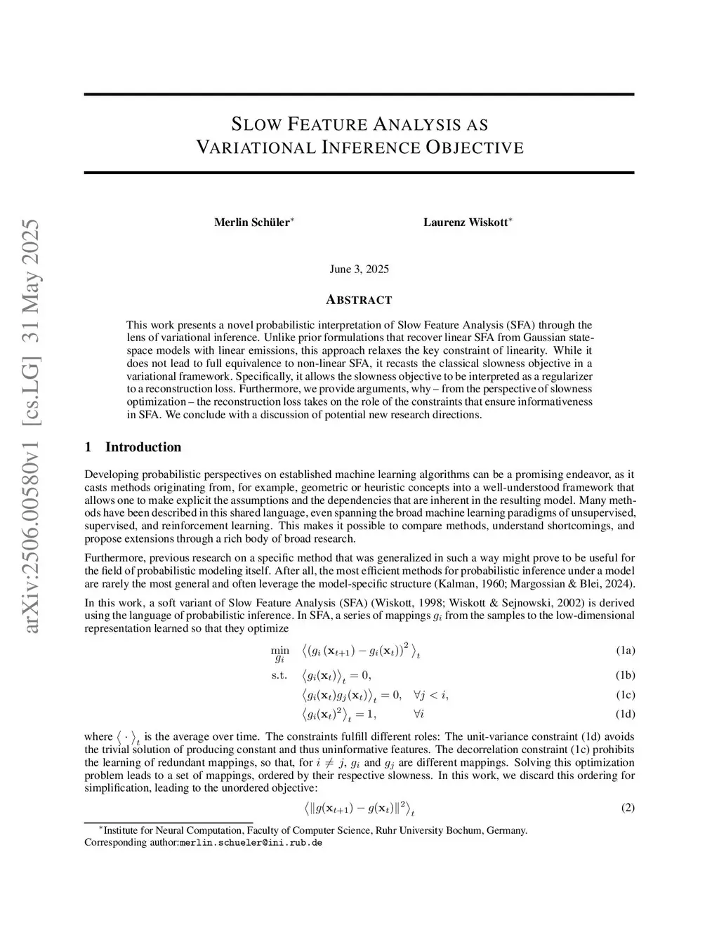 This work presents a novel probabilistic interpretation of Slow Feature Analysis (SFA) through the lens of variational inference. Unlike prior formulations that recover linear SFA from Gaussian state-space models with linear emissions, this approach relaxes the key constraint of linearity. While it does not lead to full equivalence to non-linear SFA, it recasts the classical slowness objective in a variational framework. Specifically, it allows the slowness objective to be interpreted as a regularizer to a reconstruction loss. Furthermore, we provide arguments, why -- from the perspective of slowness optimization -- the reconstruction loss takes on the role of the constraints that ensure informativeness in SFA. We conclude with a discussion of potential new research directions.