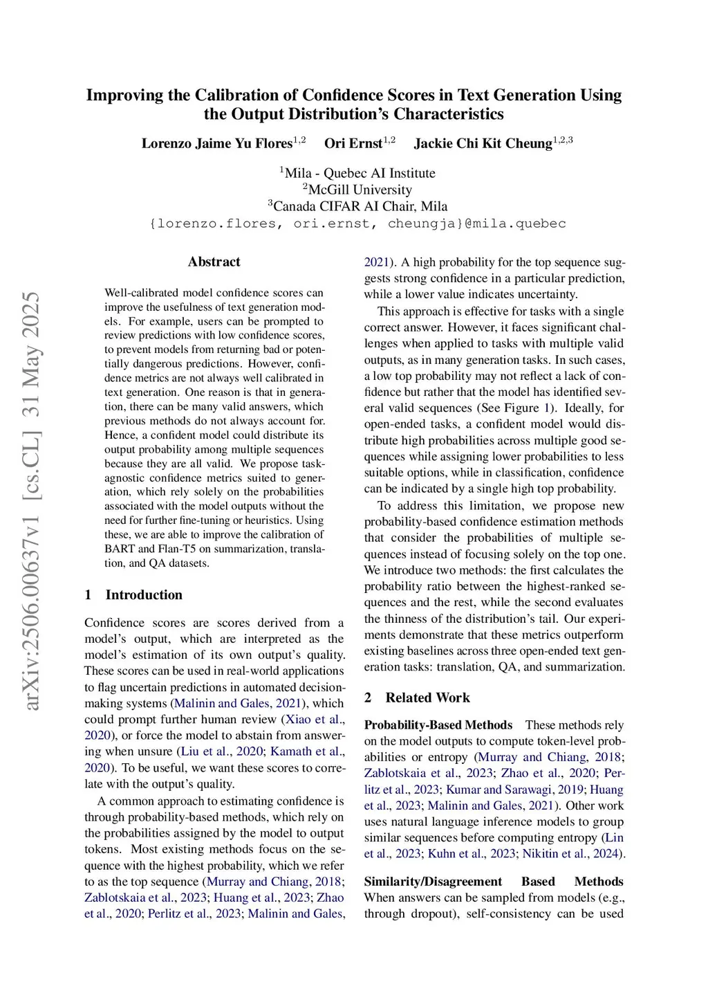 Improving the Calibration of Confidence Scores in Text Generation Using the Output Distribution's Characteristics