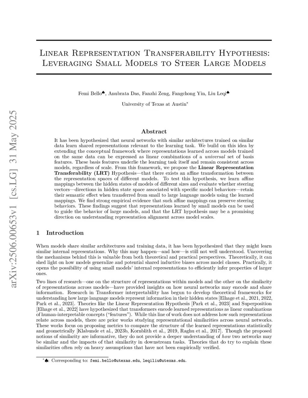 It has been hypothesized that neural networks with similar architectures trained on similar data learn shared representations relevant to the learning task. We build on this idea by extending the conceptual framework where representations learned across models trained on the same data can be expressed as linear combinations of a \emph{universal} set of basis features. These basis features underlie the learning task itself and remain consistent across models, regardless of scale. From this framework, we propose the \textbf{Linear Representation Transferability (LRT)} Hypothesis -- that there exists an affine transformation between the representation spaces of different models. To test this hypothesis, we learn affine mappings between the hidden states of models of different sizes and evaluate whether steering vectors -- directions in hidden state space associated with specific model behaviors -- retain their semantic effect when transferred from small to large language models using the learned mappings. We find strong empirical evidence that such affine mappings can preserve steering behaviors. These findings suggest that representations learned by small models can be used to guide the behavior of large models, and that the LRT hypothesis may be a promising direction on understanding representation alignment across model scales.