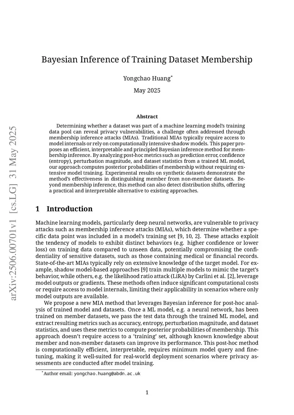 Determining whether a dataset was part of a machine learning model's training data pool can reveal privacy vulnerabilities, a challenge often addressed through membership inference attacks (MIAs). Traditional MIAs typically require access to model internals or rely on computationally intensive shadow models. This paper proposes an efficient, interpretable and principled Bayesian inference method for membership inference. By analyzing post-hoc metrics such as prediction error, confidence (entropy), perturbation magnitude, and dataset statistics from a trained ML model, our approach computes posterior probabilities of membership without requiring extensive model training. Experimental results on synthetic datasets demonstrate the method's effectiveness in distinguishing member from non-member datasets. Beyond membership inference, this method can also detect distribution shifts, offering a practical and interpretable alternative to existing approaches.