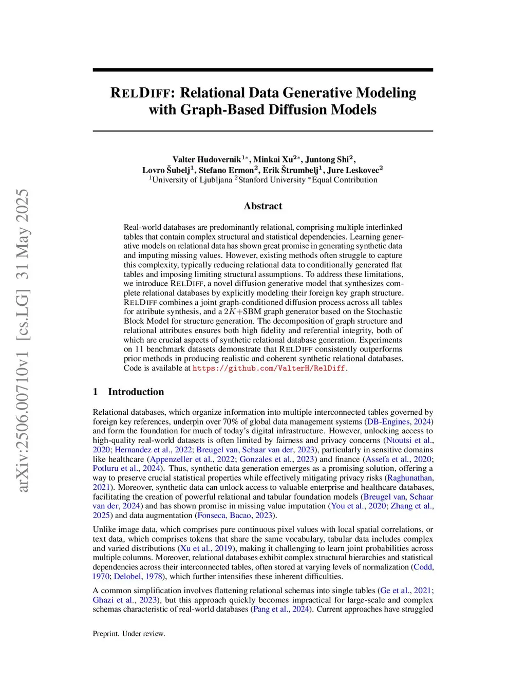 Real-world databases are predominantly relational, comprising multiple interlinked tables that contain complex structural and statistical dependencies. Learning generative models on relational data has shown great promise in generating synthetic data and imputing missing values. However, existing methods often struggle to capture this complexity, typically reducing relational data to conditionally generated flat tables and imposing limiting structural assumptions. To address these limitations, we introduce RelDiff, a novel diffusion generative model that synthesizes complete relational databases by explicitly modeling their foreign key graph structure. RelDiff combines a joint graph-conditioned diffusion process across all tables for attribute synthesis, and a SBM graph generator based on the Stochastic Block Model for structure generation. The decomposition of graph structure and relational attributes ensures both high fidelity and referential integrity, both of which are crucial aspects of synthetic relational database generation. Experiments on 11 benchmark datasets demonstrate that RelDiff consistently outperforms prior methods in producing realistic and coherent synthetic relational databases. Code is available atthis https URL.