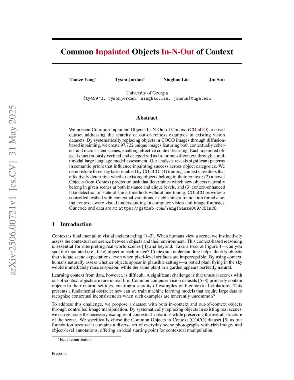 We present Common Inpainted Objects In-N-Out of Context (COinCO), a novel dataset addressing the scarcity of out-of-context examples in existing vision datasets. By systematically replacing objects in COCO images through diffusion-based inpainting, we create 97,722 unique images featuring both contextually coherent and inconsistent scenes, enabling effective context learning. Each inpainted object is meticulously verified and categorized as in- or out-of-context through a multimodal large language model assessment. Our analysis reveals significant patterns in semantic priors that influence inpainting success across object categories. We demonstrate three key tasks enabled by COinCO: (1) training context classifiers that effectively determine whether existing objects belong in their context; (2) a novel Objects-from-Context prediction task that determines which new objects naturally belong in given scenes at both instance and clique levels, and (3) context-enhanced fake detection on state-of-the-art methods without fine-tuning. COinCO provides a controlled testbed with contextual variations, establishing a foundation for advancing context-aware visual understanding in computer vision and image forensics. Our code and data are at:this https URL.