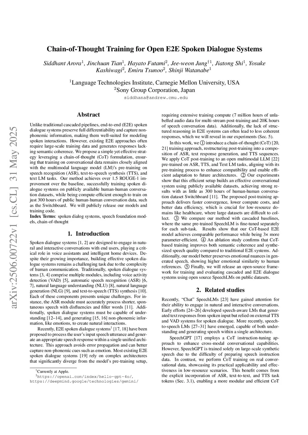Chain-of-Thought Training for Open E2E Spoken Dialogue Systems