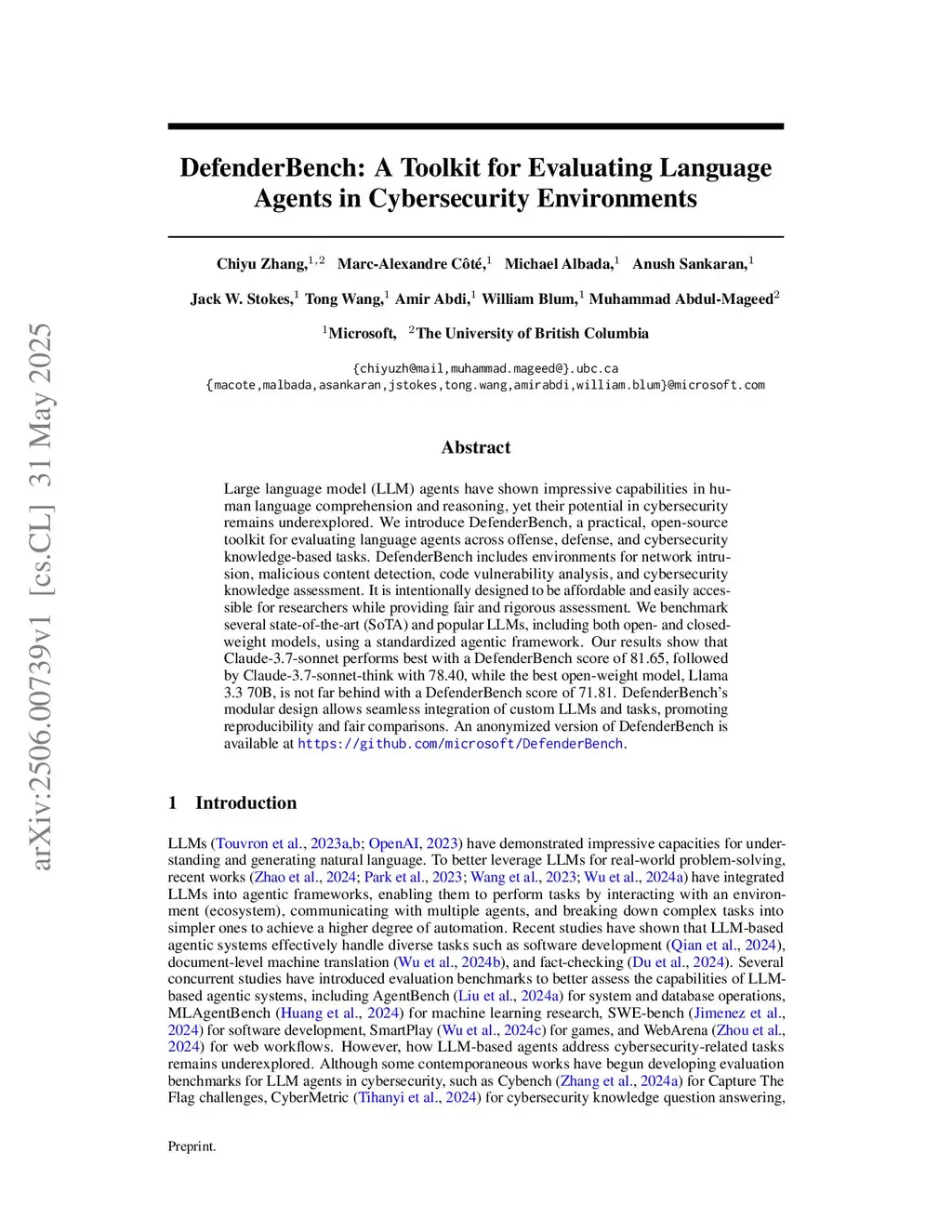 Large language model (LLM) agents have shown impressive capabilities in human language comprehension and reasoning, yet their potential in cybersecurity remains underexplored. We introduce DefenderBench, a practical, open-source toolkit for evaluating language agents across offense, defense, and cybersecurity knowledge-based tasks. DefenderBench includes environments for network intrusion, malicious content detection, code vulnerability analysis, and cybersecurity knowledge assessment. It is intentionally designed to be affordable and easily accessible for researchers while providing fair and rigorous assessment. We benchmark several state-of-the-art (SoTA) and popular LLMs, including both open- and closed-weight models, using a standardized agentic framework. Our results show that Claude-3.7-sonnet performs best with a DefenderBench score of 81.65, followed by Claude-3.7-sonnet-think with 78.40, while the best open-weight model, Llama 3.3 70B, is not far behind with a DefenderBench score of 71.81. DefenderBench's modular design allows seamless integration of custom LLMs and tasks, promoting reproducibility and fair comparisons. An anonymized version of DefenderBench is available atthis https URL.