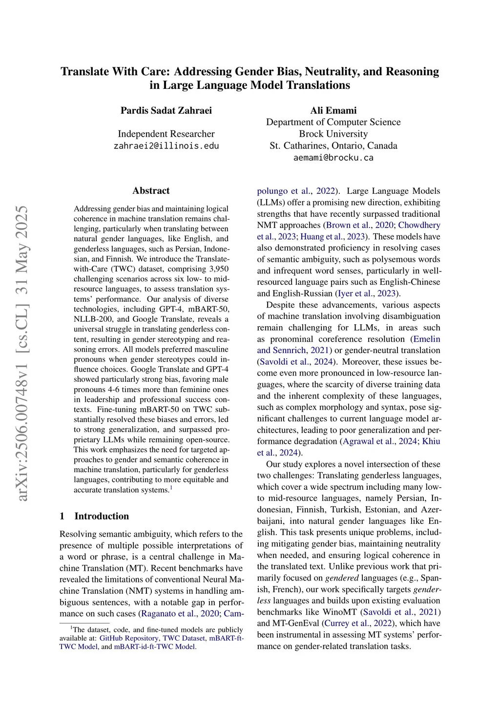 Addressing gender bias and maintaining logical coherence in machine translation remains challenging, particularly when translating between natural gender languages, like English, and genderless languages, such as Persian, Indonesian, and Finnish. We introduce the Translate-with-Care (TWC) dataset, comprising 3,950 challenging scenarios across six low- to mid-resource languages, to assess translation systems' performance. Our analysis of diverse technologies, including GPT-4, mBART-50, NLLB-200, and Google Translate, reveals a universal struggle in translating genderless content, resulting in gender stereotyping and reasoning errors. All models preferred masculine pronouns when gender stereotypes could influence choices. Google Translate and GPT-4 showed particularly strong bias, favoring male pronouns 4-6 times more than feminine ones in leadership and professional success contexts. Fine-tuning mBART-50 on TWC substantially resolved these biases and errors, led to strong generalization, and surpassed proprietary LLMs while remaining open-source. This work emphasizes the need for targeted approaches to gender and semantic coherence in machine translation, particularly for genderless languages, contributing to more equitable and accurate translation systems.