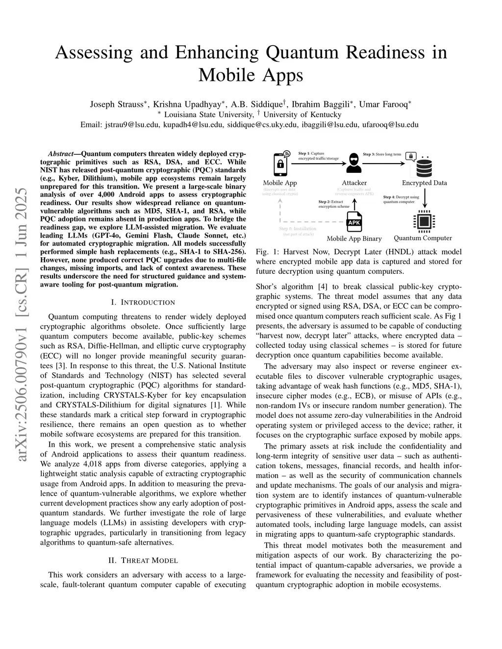 Quantum computers threaten widely deployed cryptographic primitives such as RSA, DSA, and ECC. While NIST has released post-quantum cryptographic (PQC) standards (e.g., Kyber, Dilithium), mobile app ecosystems remain largely unprepared for this transition. We present a large-scale binary analysis of over 4,000 Android apps to assess cryptographic readiness. Our results show widespread reliance on quantum-vulnerable algorithms such as MD5, SHA-1, and RSA, while PQC adoption remains absent in production apps. To bridge the readiness gap, we explore LLM-assisted migration. We evaluate leading LLMs (GPT-4o, Gemini Flash, Claude Sonnet, etc.) for automated cryptographic migration. All models successfully performed simple hash replacements (e.g., SHA-1 to SHA-256). However, none produced correct PQC upgrades due to multi-file changes, missing imports, and lack of context awareness. These results underscore the need for structured guidance and system-aware tooling for post-quantum migration