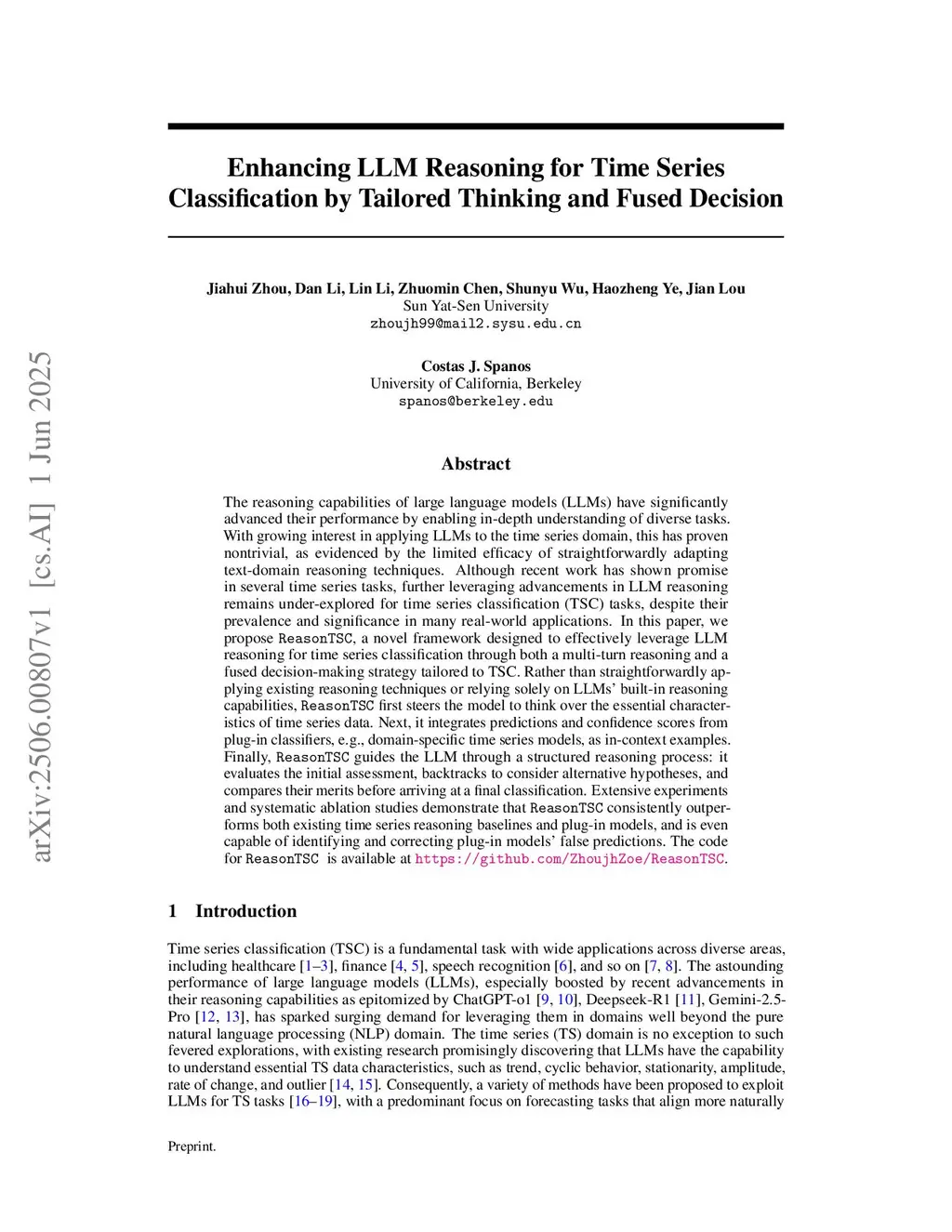 The reasoning capabilities of large language models (LLMs) have significantly advanced their performance by enabling in-depth understanding of diverse tasks. With growing interest in applying LLMs to the time series domain, this has proven nontrivial, as evidenced by the limited efficacy of straightforwardly adapting text-domain reasoning techniques. Although recent work has shown promise in several time series tasks, further leveraging advancements in LLM reasoning remains under-explored for time series classification (TSC) tasks, despite their prevalence and significance in many real-world applications. In this paper, we propose ReasonTSC, a novel framework designed to effectively leverage LLM reasoning for time series classification through both a multi-turn reasoning and a fused decision-making strategy tailored to TSC. Rather than straightforwardly applying existing reasoning techniques or relying solely on LLMs' built-in reasoning capabilities, ReasonTSC first steers the model to think over the essential characteristics of time series data. Next, it integrates predictions and confidence scores from plug-in classifiers, e.g., domain-specific time series models, as in-context examples. Finally, ReasonTSC guides the LLM through a structured reasoning process: it evaluates the initial assessment, backtracks to consider alternative hypotheses, and compares their merits before arriving at a final classification. Extensive experiments and systematic ablation studies demonstrate that ReasonTSC consistently outperforms both existing time series reasoning baselines and plug-in models, and is even capable of identifying and correcting plug-in models' false predictions.