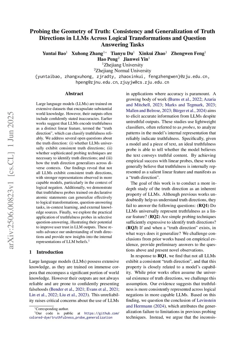 Large language models (LLMs) are trained on extensive datasets that encapsulate substantial world knowledge. However, their outputs often include confidently stated inaccuracies. Earlier works suggest that LLMs encode truthfulness as a distinct linear feature, termed the "truth direction", which can classify truthfulness reliably. We address several open questions about the truth direction: (i) whether LLMs universally exhibit consistent truth directions; (ii) whether sophisticated probing techniques are necessary to identify truth directions; and (iii) how the truth direction generalizes across diverse contexts. Our findings reveal that not all LLMs exhibit consistent truth directions, with stronger representations observed in more capable models, particularly in the context of logical negation. Additionally, we demonstrate that truthfulness probes trained on declarative atomic statements can generalize effectively to logical transformations, question-answering tasks, in-context learning, and external knowledge sources. Finally, we explore the practical application of truthfulness probes in selective question-answering, illustrating their potential to improve user trust in LLM outputs. These results advance our understanding of truth directions and provide new insights into the internal representations of LLM beliefs. Our code is public atthis https URL
