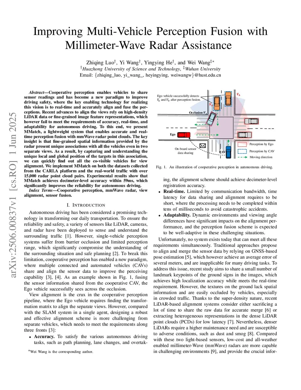 Cooperative perception enables vehicles to share sensor readings and has become a new paradigm to improve driving safety, where the key enabling technology for realizing this vision is to real-time and accurately align and fuse the perceptions. Recent advances to align the views rely on high-density LiDAR data or fine-grained image feature representations, which however fail to meet the requirements of accuracy, real-time, and adaptability for autonomous driving. To this end, we present MMatch, a lightweight system that enables accurate and real-time perception fusion with mmWave radar point clouds. The key insight is that fine-grained spatial information provided by the radar present unique associations with all the vehicles even in two separate views. As a result, by capturing and understanding the unique local and global position of the targets in this association, we can quickly find out all the co-visible vehicles for view alignment. We implement MMatch on both the datasets collected from the CARLA platform and the real-world traffic with over 15,000 radar point cloud pairs. Experimental results show that MMatch achieves decimeter-level accuracy within 59ms, which significantly improves the reliability for autonomous driving.