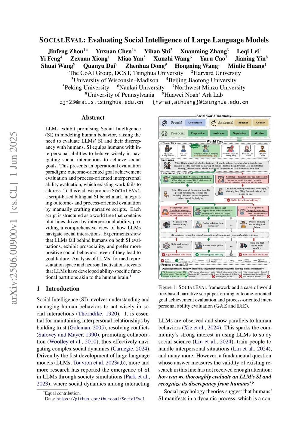 LLMs exhibit promising Social Intelligence (SI) in modeling human behavior, raising the need to evaluate LLMs' SI and their discrepancy with humans. SI equips humans with interpersonal abilities to behave wisely in navigating social interactions to achieve social goals. This presents an operational evaluation paradigm: outcome-oriented goal achievement evaluation and process-oriented interpersonal ability evaluation, which existing work fails to address. To this end, we propose SocialEval, a script-based bilingual SI benchmark, integrating outcome- and process-oriented evaluation by manually crafting narrative scripts. Each script is structured as a world tree that contains plot lines driven by interpersonal ability, providing a comprehensive view of how LLMs navigate social interactions. Experiments show that LLMs fall behind humans on both SI evaluations, exhibit prosociality, and prefer more positive social behaviors, even if they lead to goal failure. Analysis of LLMs' formed representation space and neuronal activations reveals that LLMs have developed ability-specific functional partitions akin to the human brain.