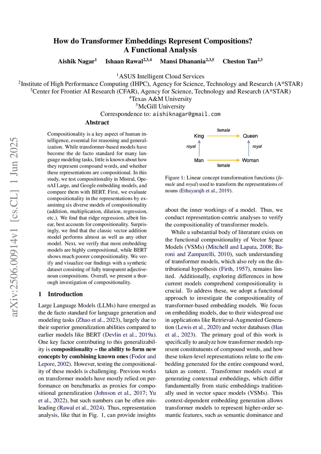 How do Transformer Embeddings Represent Compositions? A Functional Analysis