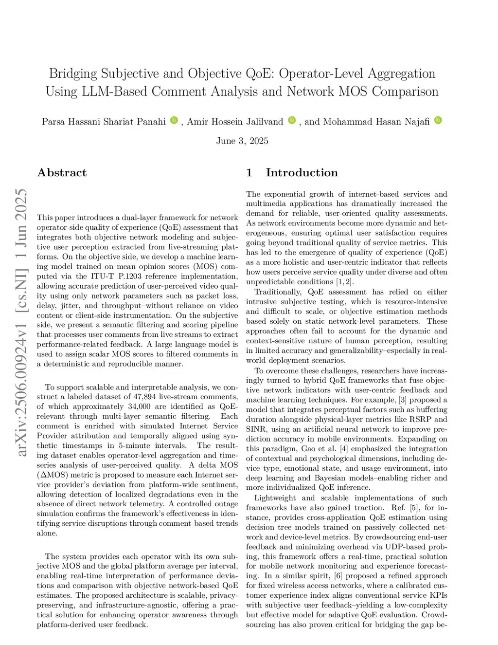 This paper introduces a dual-layer framework for network operator-side quality of experience (QoE) assessment that integrates both objective network modeling and subjective user perception extracted from live-streaming platforms. On the objective side, we develop a machine learning model trained on mean opinion scores (MOS) computed via the ITU-T P.1203 reference implementation, allowing accurate prediction of user-perceived video quality using only network parameters such as packet loss, delay, jitter, and throughput without reliance on video content or client-side instrumentation. On the subjective side, we present a semantic filtering and scoring pipeline that processes user comments from live streams to extract performance-related feedback. A large language model is used to assign scalar MOS scores to filtered comments in a deterministic and reproducible manner. To support scalable and interpretable analysis, we construct a labeled dataset of 47,894 live-stream comments, of which about 34,000 are identified as QoE-relevant through multi-layer semantic filtering. Each comment is enriched with simulated Internet Service Provider attribution and temporally aligned using synthetic timestamps in 5-min intervals. The resulting dataset enables operator-level aggregation and time-series analysis of user-perceived quality. A delta MOS metric is proposed to measure each Internet service provider's deviation from platform-wide sentiment, allowing detection of localized degradations even in the absence of direct network telemetry. A controlled outage simulation confirms the framework's effectiveness in identifying service disruptions through comment-based trends alone. The system provides each operator with its own subjective MOS and the global platform average per interval, enabling real-time interpretation of performance deviations and comparison with objective network-based QoE estimates.