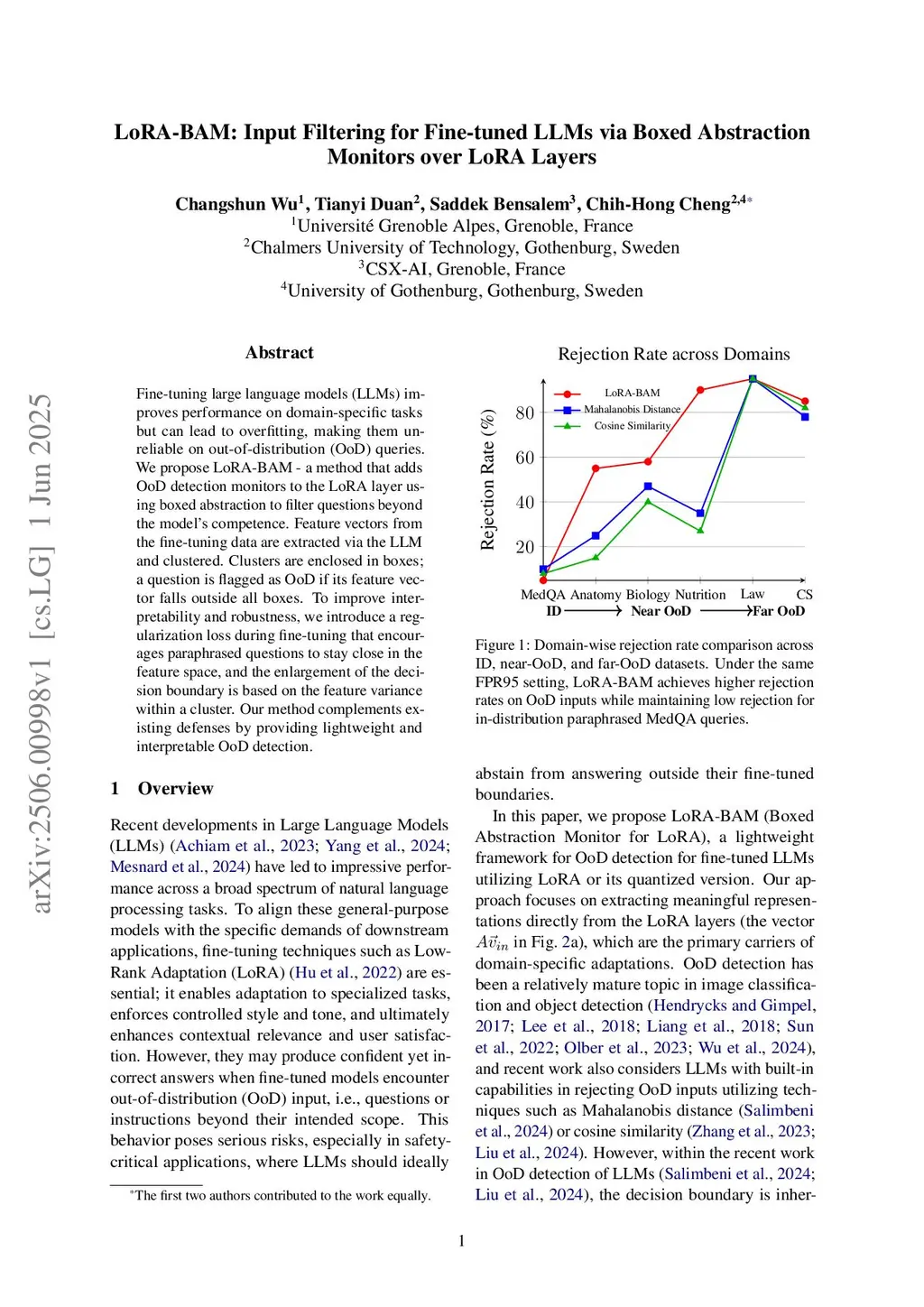 Fine-tuning large language models (LLMs) improves performance on domain-specific tasks but can lead to overfitting, making them unreliable on out-of-distribution (OoD) queries. We propose LoRA-BAM - a method that adds OoD detection monitors to the LoRA layer using boxed abstraction to filter questions beyond the model's competence. Feature vectors from the fine-tuning data are extracted via the LLM and clustered. Clusters are enclosed in boxes; a question is flagged as OoD if its feature vector falls outside all boxes. To improve interpretability and robustness, we introduce a regularization loss during fine-tuning that encourages paraphrased questions to stay close in the feature space, and the enlargement of the decision boundary is based on the feature variance within a cluster. Our method complements existing defenses by providing lightweight and interpretable OoD detection.