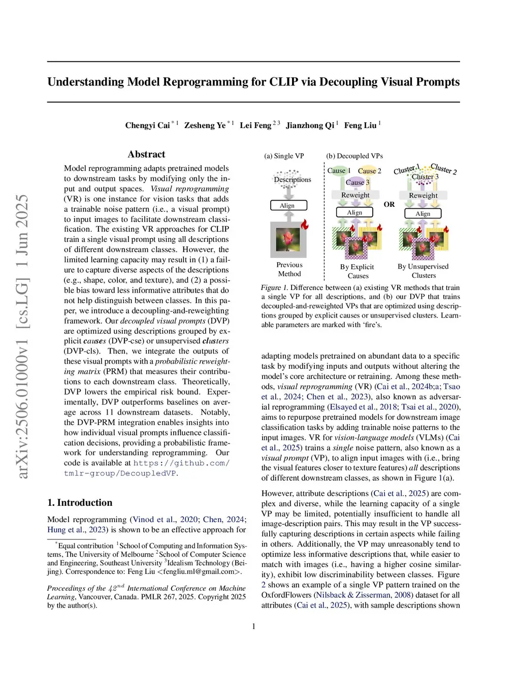 Model reprogramming adapts pretrained models to downstream tasks by modifying only the input and output spaces. Visual reprogramming (VR) is one instance for vision tasks that adds a trainable noise pattern (i.e., a visual prompt) to input images to facilitate downstream classification. The existing VR approaches for CLIP train a single visual prompt using all descriptions of different downstream classes. However, the limited learning capacity may result in (1) a failure to capture diverse aspects of the descriptions (e.g., shape, color, and texture), and (2) a possible bias toward less informative attributes that do not help distinguish between classes. In this paper, we introduce a decoupling-and-reweighting framework. Our decoupled visual prompts (DVP) are optimized using descriptions grouped by explicit causes (DVP-cse) or unsupervised clusters (DVP-cls). Then, we integrate the outputs of these visual prompts with a probabilistic reweighting matrix (PRM) that measures their contributions to each downstream class. Theoretically, DVP lowers the empirical risk bound. Experimentally, DVP outperforms baselines on average across 11 downstream datasets. Notably, the DVP-PRM integration enables insights into how individual visual prompts influence classification decisions, providing a probabilistic framework for understanding reprogramming. Our code is available atthis https URL.