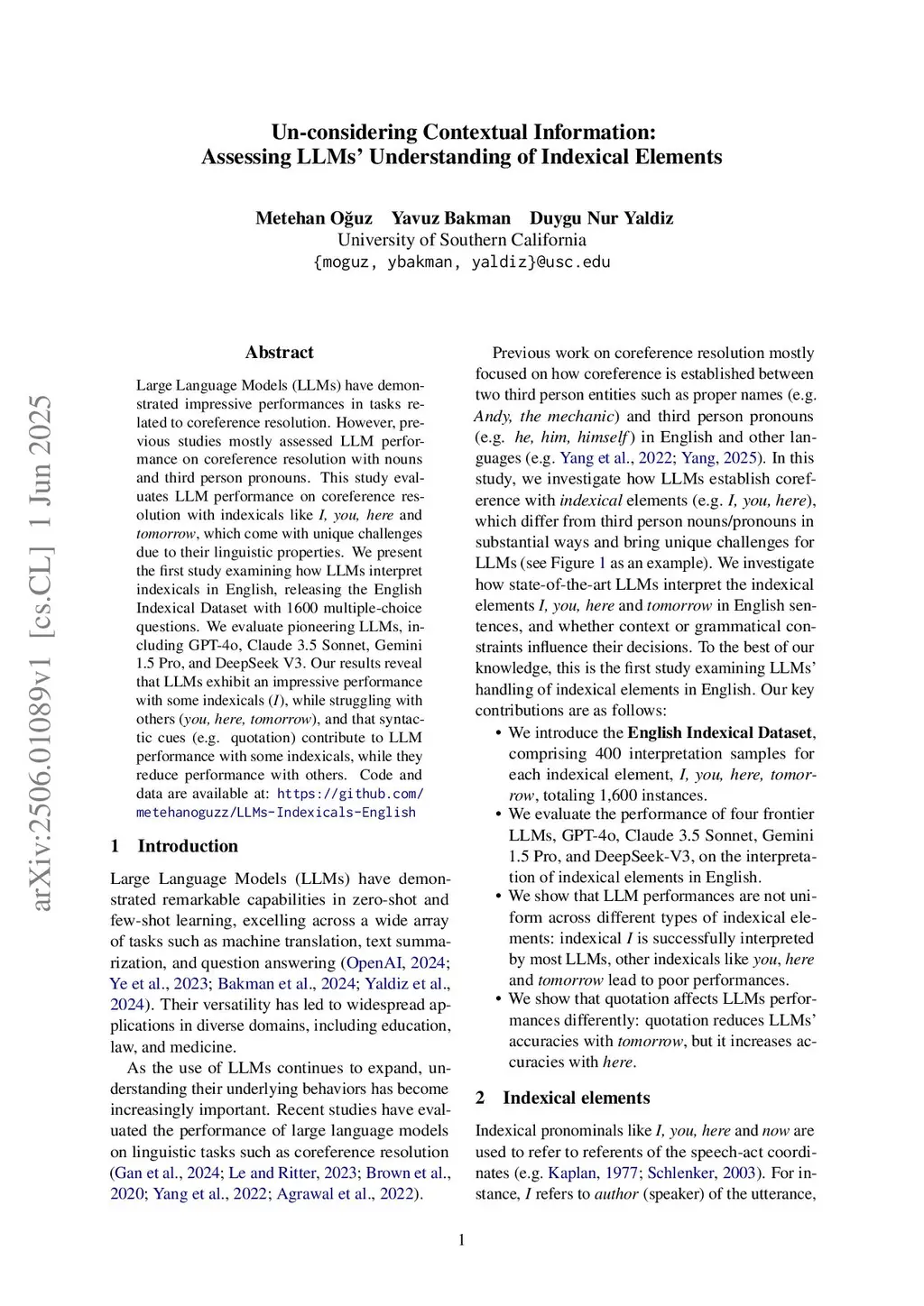 Large Language Models (LLMs) have demonstrated impressive performances in tasks related to coreference resolution. However, previous studies mostly assessed LLM performance on coreference resolution with nouns and third person pronouns. This study evaluates LLM performance on coreference resolution with indexical like I, you, here and tomorrow, which come with unique challenges due to their linguistic properties. We present the first study examining how LLMs interpret indexicals in English, releasing the English Indexical Dataset with 1600 multiple-choice questions. We evaluate pioneering LLMs, including GPT-4o, Claude 3.5 Sonnet, Gemini 1.5 Pro, and DeepSeek V3. Our results reveal that LLMs exhibit an impressive performance with some indexicals (I), while struggling with others (you, here, tomorrow), and that syntactic cues (e.g. quotation) contribute to LLM performance with some indexicals, while they reduce performance with others. Code and data are available at:this https URL.