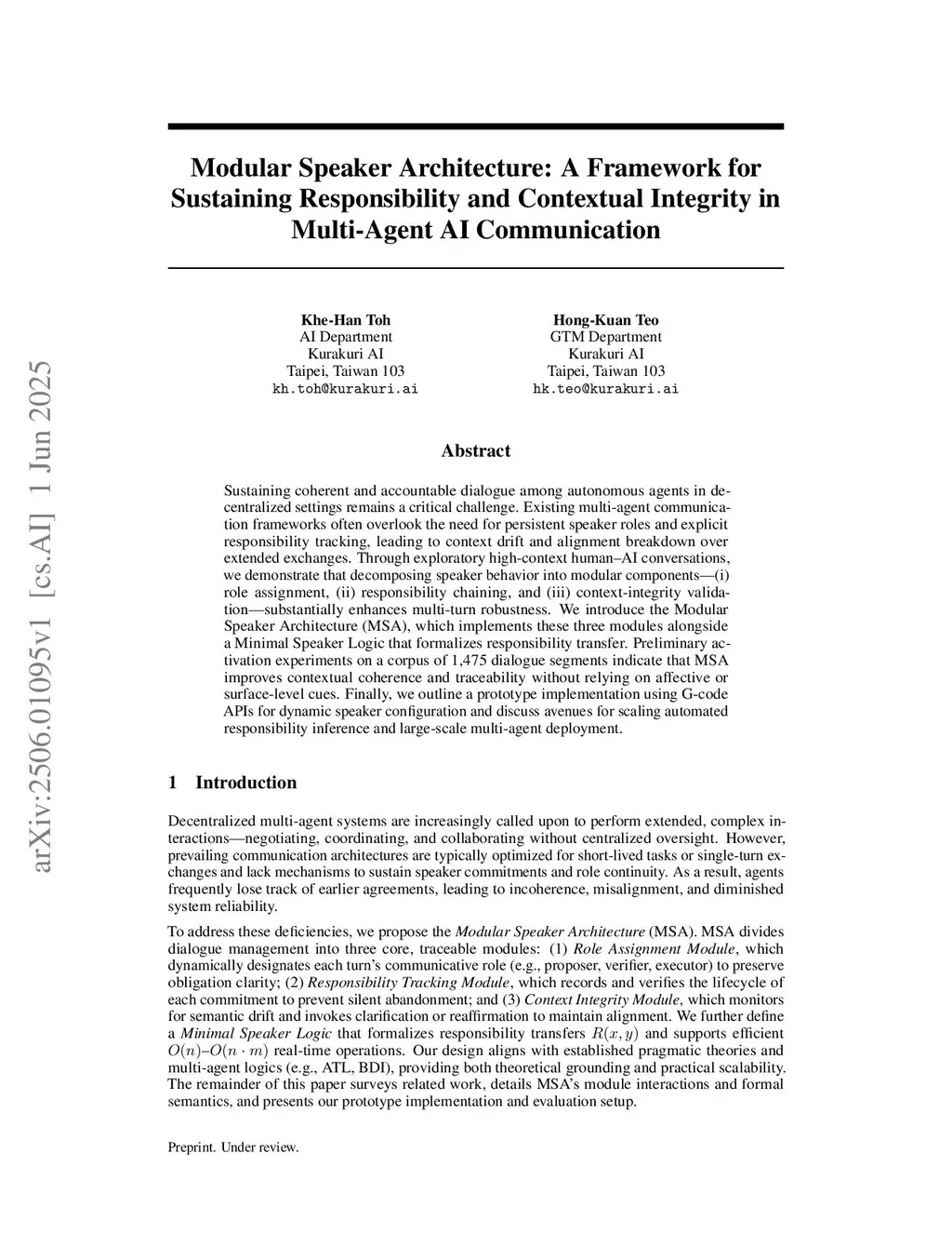 Sustaining coherent, role-aware communication across multi-agent systems remains a foundational challenge in AI. Current frameworks often lack explicit mechanisms for speaker responsibility, leading to context drift, alignment instability, and degraded interpretability over time. We propose the Modular Speaker Architecture (MSA), a framework that decomposes speaker behavior into modular components for role tracking, responsibility continuity, and contextual coherence. Grounded in high-context human-AI dialogues, MSA includes three core modules: a Speaker Role Module, a Responsibility Chain Tracker, and a Contextual Integrity Validator. We evaluate MSA through annotated case studies and introduce structural metrics-pragmatic consistency, responsibility flow, and context stability-quantified via manual and automatic scoring and bootstrapped statistical analysis. Our results show that MSA reliably maintains interaction structure without reliance on affective signals or surface-level heuristics. We further implement a prototype configuration language (G-Code) and modular API to support MSA deployment in dynamic multi-agent scenarios.