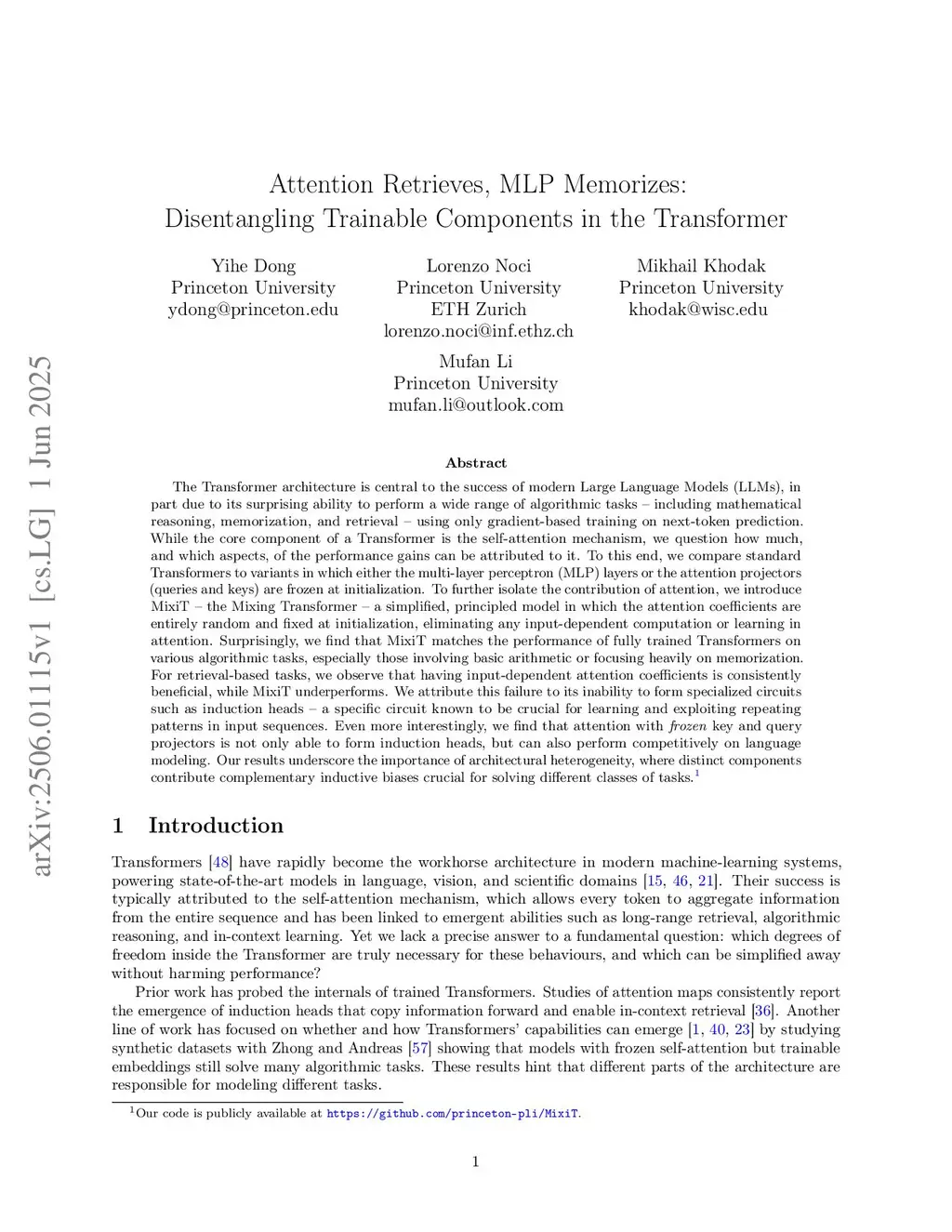 The Transformer architecture is central to the success of modern Large Language Models (LLMs), in part due to its surprising ability to perform a wide range of algorithmic tasks -- including mathematical reasoning, memorization, and retrieval -- using only gradient-based training on next-token prediction. While the core component of a Transformer is the self-attention mechanism, we question how much, and which aspects, of the performance gains can be attributed to it. To this end, we compare standard Transformers to variants in which either the multi-layer perceptron (MLP) layers or the attention projectors (queries and keys) are frozen at initialization. To further isolate the contribution of attention, we introduce MixiT -- the Mixing Transformer -- a simplified, principled model in which the attention coefficients are entirely random and fixed at initialization, eliminating any input-dependent computation or learning in attention. Surprisingly, we find that MixiT matches the performance of fully trained Transformers on various algorithmic tasks, especially those involving basic arithmetic or focusing heavily on memorization. For retrieval-based tasks, we observe that having input-dependent attention coefficients is consistently beneficial, while MixiT underperforms. We attribute this failure to its inability to form specialized circuits such as induction heads -- a specific circuit known to be crucial for learning and exploiting repeating patterns in input sequences. Even more interestingly, we find that attention with frozen key and query projectors is not only able to form induction heads, but can also perform competitively on language modeling. Our results underscore the importance of architectural heterogeneity, where distinct components contribute complementary inductive biases crucial for solving different classes of tasks.