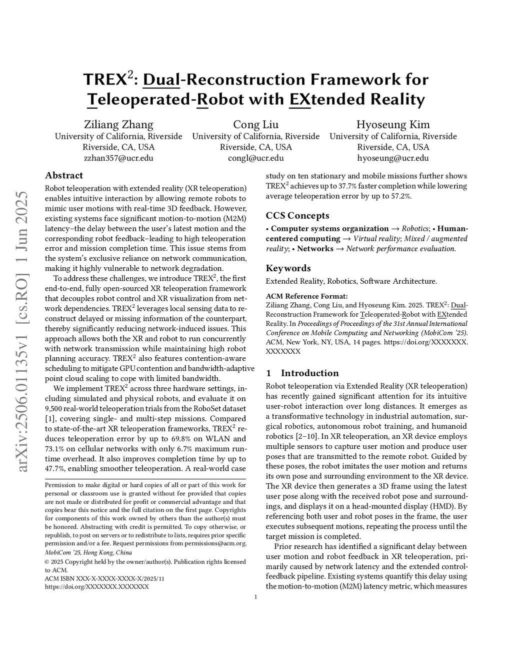 Robot teleoperation with extended reality (XR teleoperation) enables intuitive interaction by allowing remote robots to mimic user motions with real-time 3D feedback. However, existing systems face significant motion-to-motion (M2M) latency--the delay between the user's latest motion and the corresponding robot feedback--leading to high teleoperation error and mission completion time. This issue stems from the system's exclusive reliance on network communication, making it highly vulnerable to network degradation.To address these challenges, we introduce TeleXR, the first end-to-end, fully open-sourced XR teleoperation framework that decouples robot control and XR visualization from network dependencies. TeleXR leverages local sensing data to reconstruct delayed or missing information of the counterpart, thereby significantly reducing network-induced issues. This approach allows both the XR and robot to run concurrently with network transmission while maintaining high robot planning accuracy. TeleXR also features contention-aware scheduling to mitigate GPU contention and bandwidth-adaptive point cloud scaling to cope with limited bandwidth.