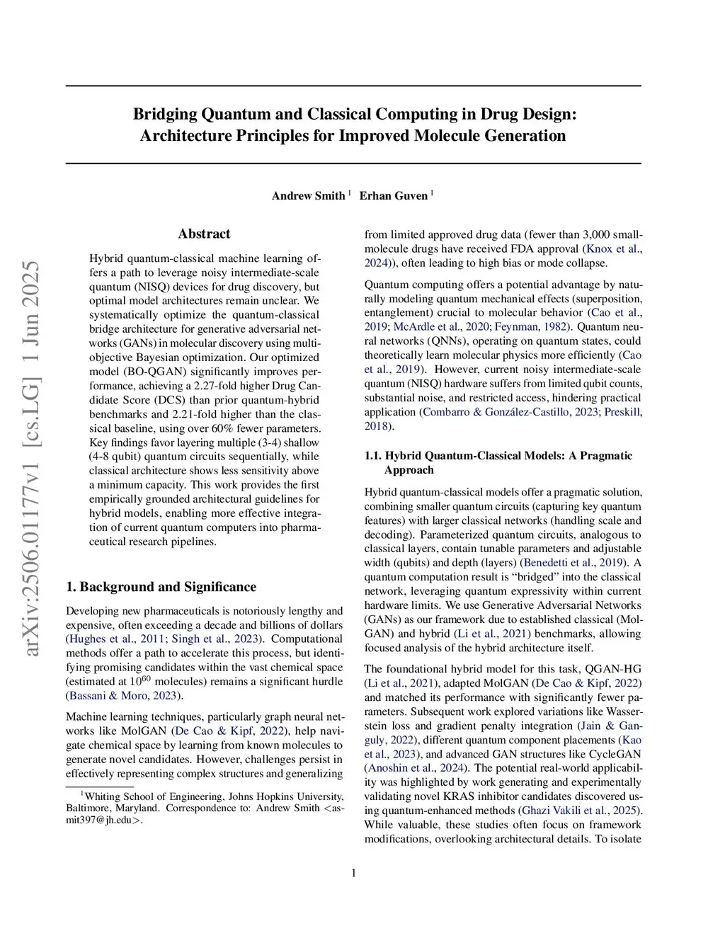 Hybrid quantum-classical machine learning offers a path to leverage noisy intermediate-scale quantum (NISQ) devices for drug discovery, but optimal model architectures remain unclear. We systematically optimize the quantum-classical bridge architecture of generative adversarial networks (GANs) for molecule discovery using multi-objective Bayesian optimization. Our optimized model (BO-QGAN) significantly improves performance, achieving a 2.27-fold higher Drug Candidate Score (DCS) than prior quantum-hybrid benchmarks and 2.21-fold higher than the classical baseline, while reducing parameter count by more than 60%. Key findings favor layering multiple (3-4) shallow (4-8 qubit) quantum circuits sequentially, while classical architecture shows less sensitivity above a minimum capacity. This work provides the first empirically-grounded architectural guidelines for hybrid models, enabling more effective integration of current quantum computers into pharmaceutical research pipelines.