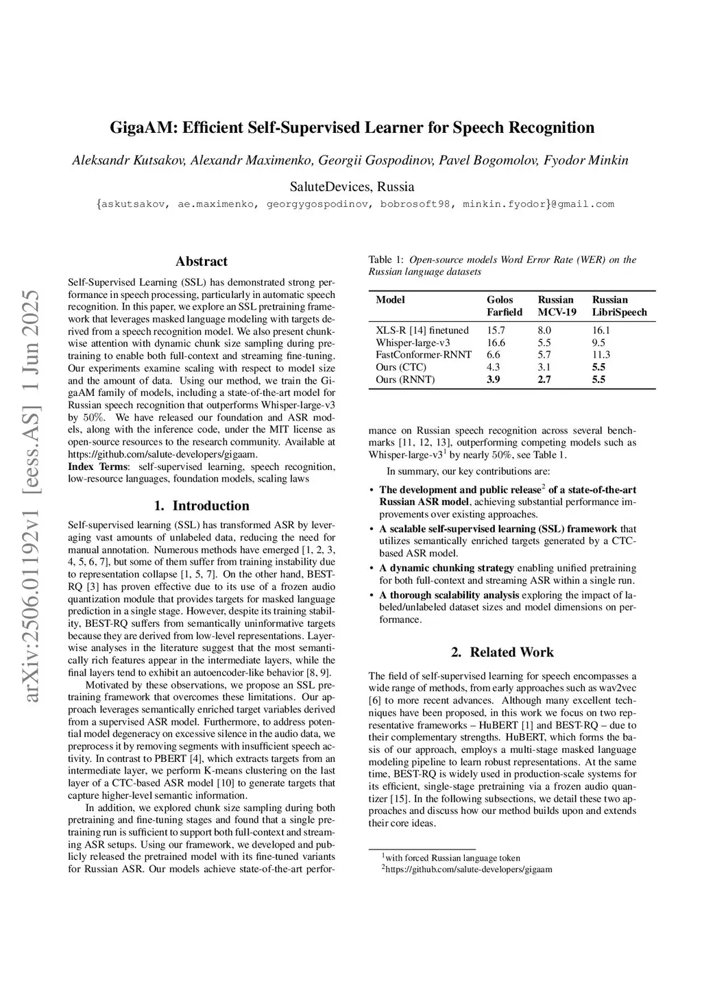 Self-Supervised Learning (SSL) has demonstrated strong performance in speech processing, particularly in automatic speech recognition. In this paper, we explore an SSL pretraining framework that leverages masked language modeling with targets derived from a speech recognition model. We also present chunkwise attention with dynamic chunk size sampling during pretraining to enable both full-context and streaming fine-tuning. Our experiments examine scaling with respect to model size and the amount of data. Using our method, we train the GigaAM family of models, including a state-of-the-art model for Russian speech recognition that outperforms Whisper-large-v3 by 50%. We have released our foundation and ASR models, along with the inference code, under the MIT license as open-source resources to the research community. Available atthis https URL.