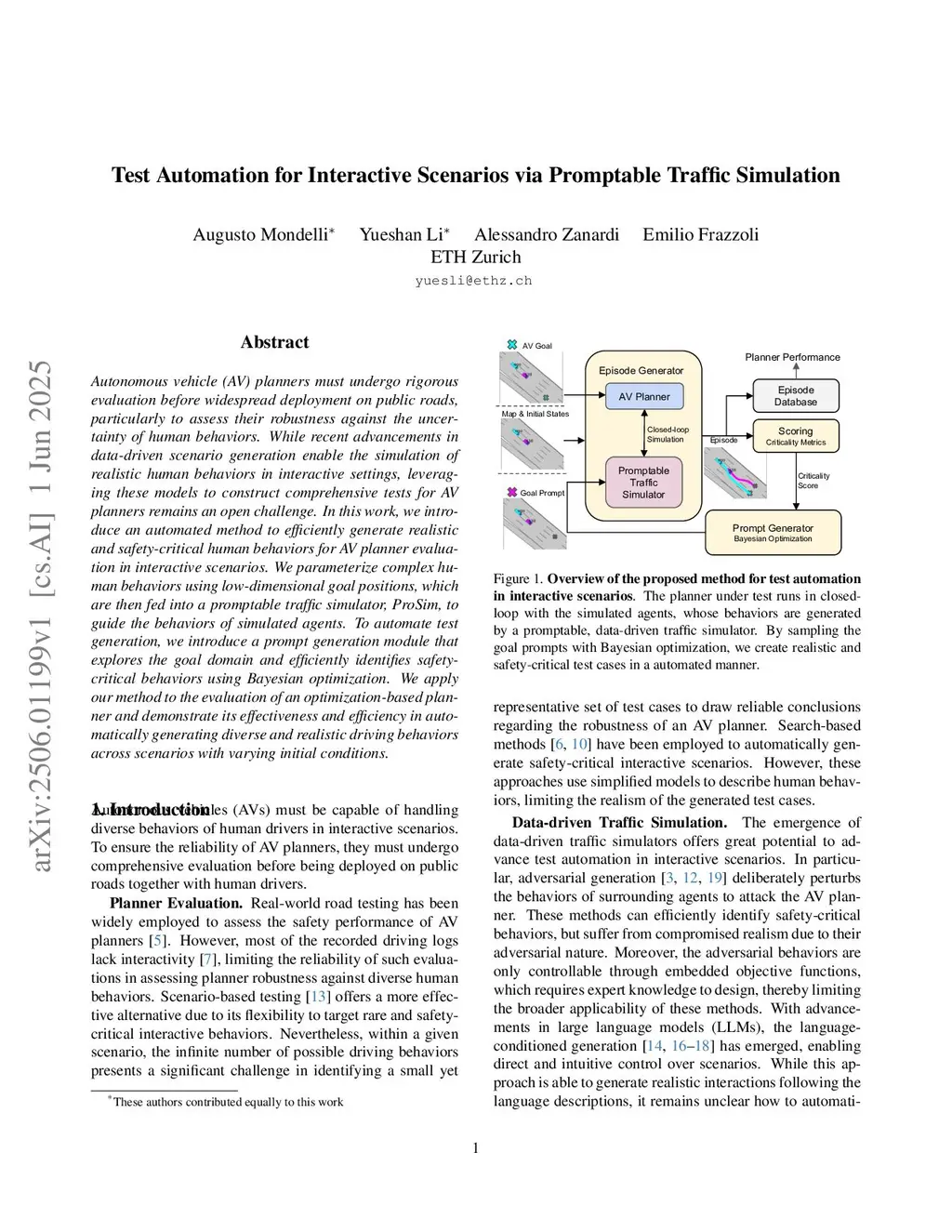 Autonomous vehicle (AV) planners must undergo rigorous evaluation before widespread deployment on public roads, particularly to assess their robustness against the uncertainty of human behaviors. While recent advancements in data-driven scenario generation enable the simulation of realistic human behaviors in interactive settings, leveraging these models to construct comprehensive tests for AV planners remains an open challenge. In this work, we introduce an automated method to efficiently generate realistic and safety-critical human behaviors for AV planner evaluation in interactive scenarios. We parameterize complex human behaviors using low-dimensional goal positions, which are then fed into a promptable traffic simulator, ProSim, to guide the behaviors of simulated agents. To automate test generation, we introduce a prompt generation module that explores the goal domain and efficiently identifies safety-critical behaviors using Bayesian optimization. We apply our method to the evaluation of an optimization-based planner and demonstrate its effectiveness and efficiency in automatically generating diverse and realistic driving behaviors across scenarios with varying initial conditions.